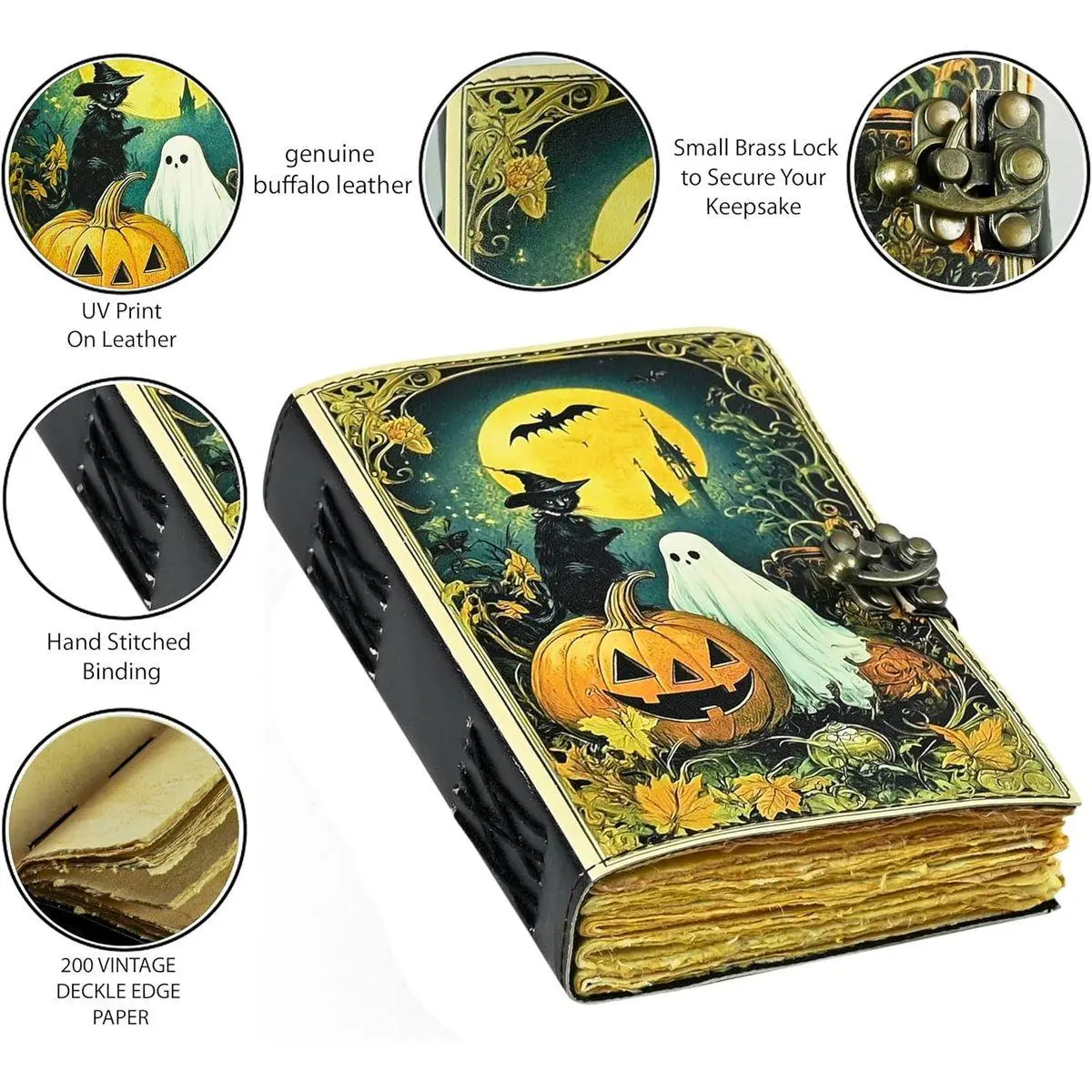 "VINTAGE LOCK AND STURDY LEATHER BOUND JOURNAL SPELL BOOK - The vintage clasp lock will keep all your valuable writing locked inside.Sturdy hand stitched binding to make sure that no paper comes out loose from your Hocus Pocus BOOK. "
