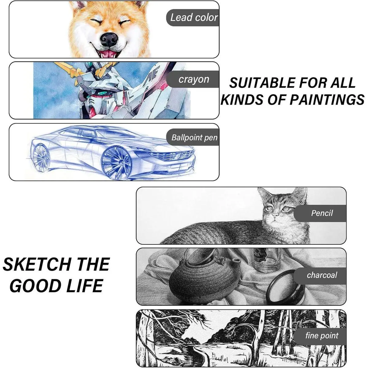 【Practical Features】Fine smooth thick paper, suitable for any dry pen, such as colored pencils, charcoal, sketching sticks, etc.NOT applicable to markers and Watercolor pen.