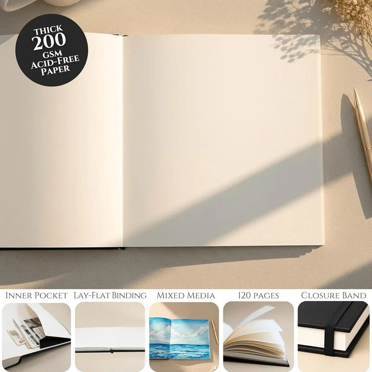 PREMIUM VEGAN LEATHER COVER & LAY-FLAT BINDING: Textured black vegan leather hardcover with elegant gold “Sketch Book” title, elastic closure band and 120 pages. The lay-flat binding makes it comfortable to work across the full spread, and the inner pocket keeps loose notes, tickets or reference photos safely stored.