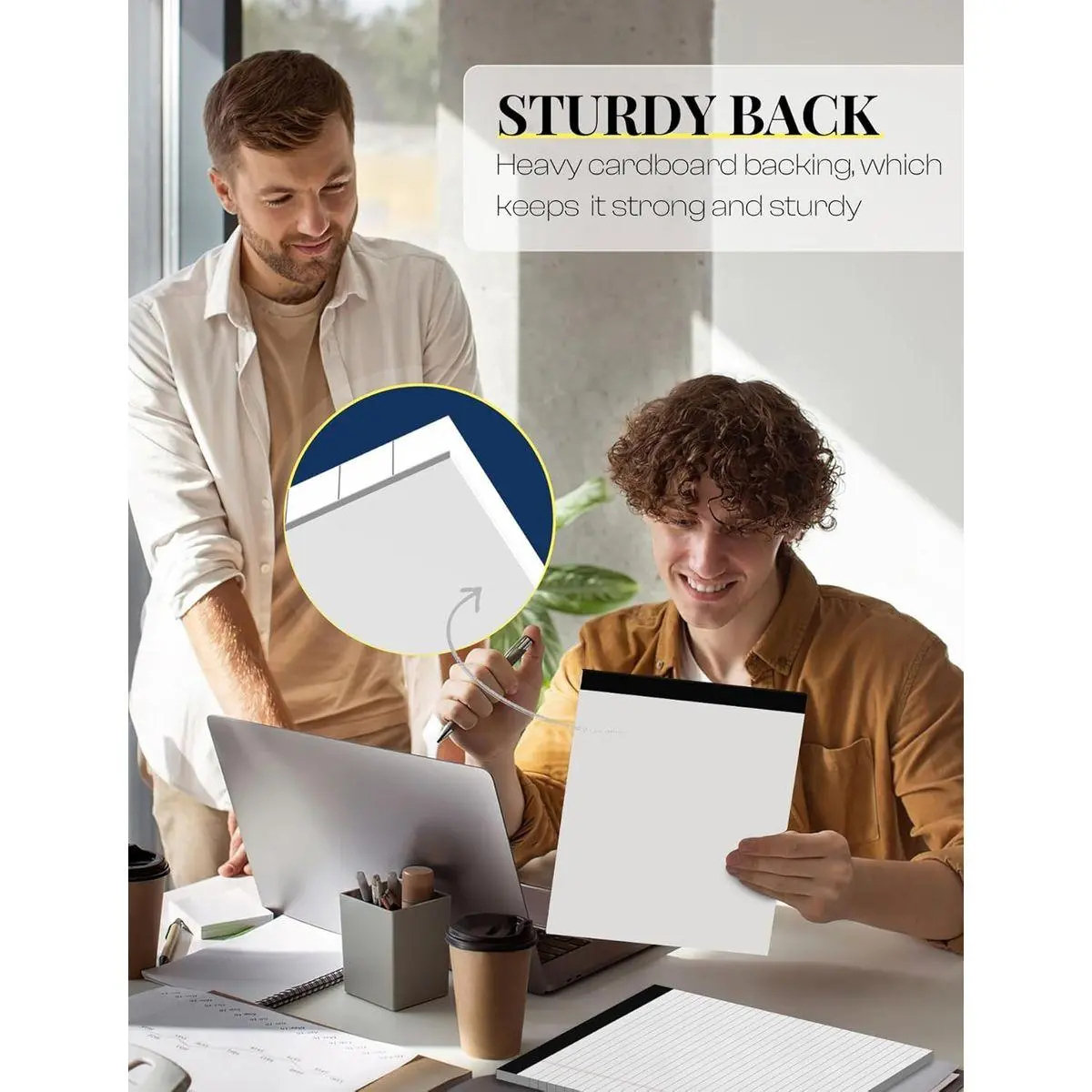 [KEEP NOTES SECURE]: Each white legal pads 8.5 x 11 wide ruled has black top bindings. The writing tablets 8.5 x 11 perforated top edge allows for easily and neatly removing individual sheet of paper. Legal pads white has sturdy and resistant bindings keep the pages of crucial notes protected, writing pad won't fall apart under pressure like some lesser notepads. Paper tablets 8-1/2 x 11 features a thick & strong cardboard backing for extra support when writing thicker than standard legal pad.
