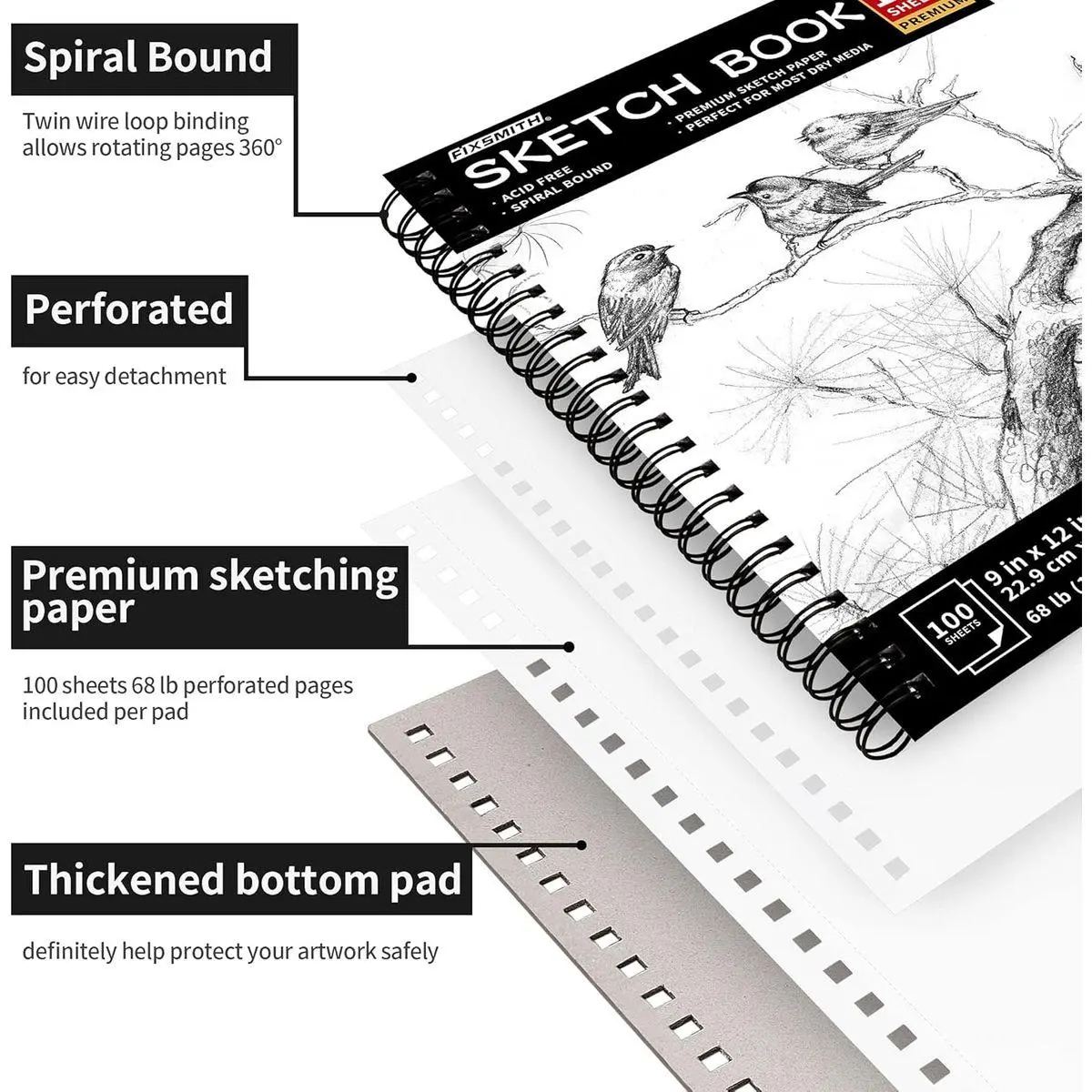【COMPACT SIZE WITH PROTECTIVE COVER】100 sheets for each sketch pad, 9" x 12" size, extremely strong toughness and durability of this sketching paper pad allows for erasing without damaging paper surface, this spiral sketchbook is perfect for drawing, sketching and writing. A great gift for drawing enthusiasts, we're sure that you will love FIXSMITH sketching books.