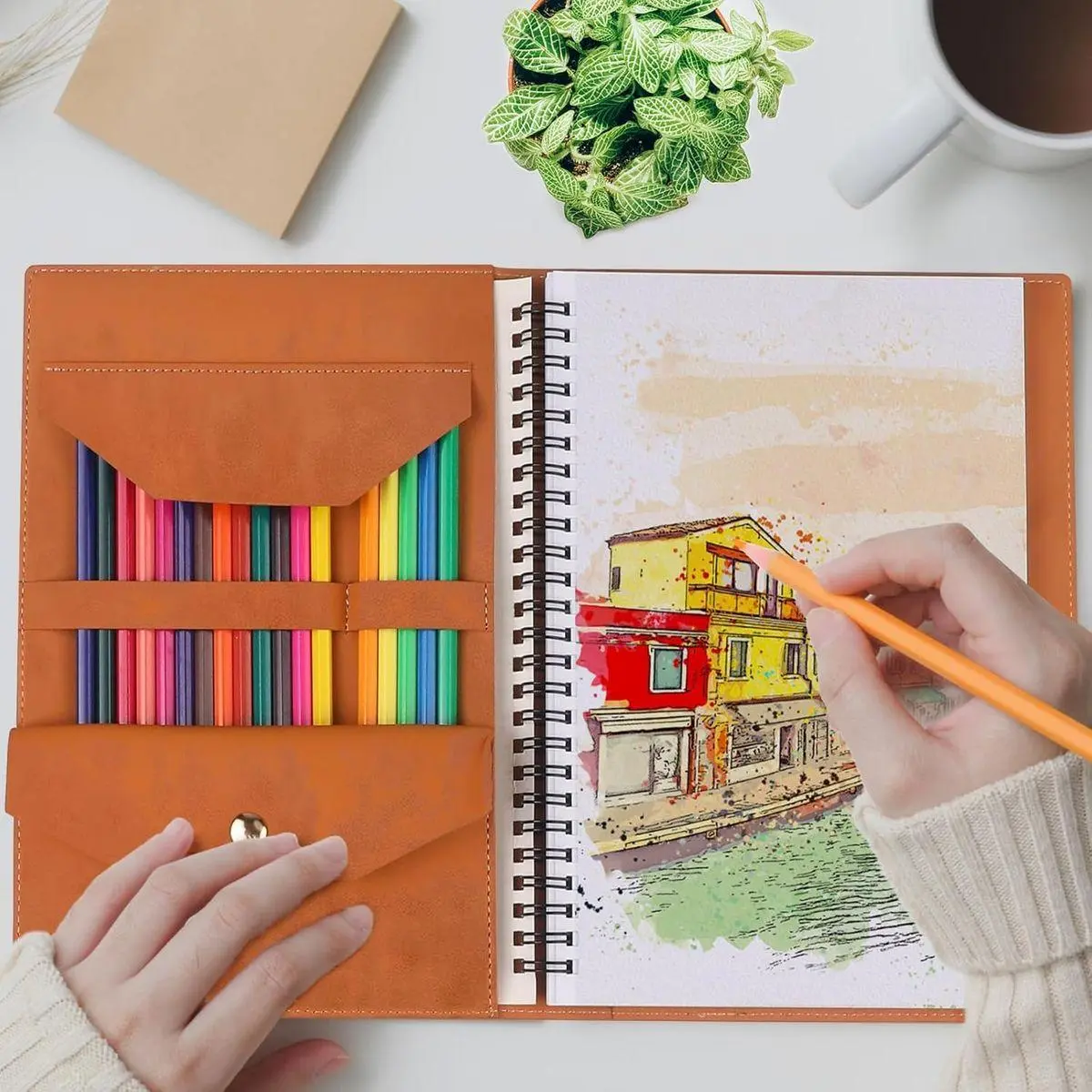 【High-quality materials】This product features premium PU leather that is meticulously crafted to provide an exceptional tactile experience and long-lasting protection.The wrap-around leather strap not only secures the journal but also serves as a convenient bookmark. The oil-soluble pencil lead offers superior adhesion and vivid color reproduction, resulting in bright and fine lines. Additionally, the included plastic pencil sharpener is designed for durability.