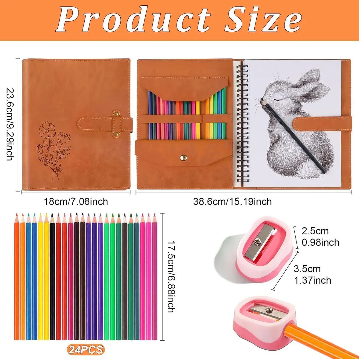 【Ideal Dimensions】This custom-made 7.9 x 9.5 inch sketchbook is ideally suited for artists at all skill levels, providing ample space for multiple pencils. The set of 24-color colored pencils, each measuring approximately 6.9 inches in length, ensures both suitability and durability. Additionally, the thumb-shaped pencil sharpener measures about 1.4 inches in length, making it compact and portable.