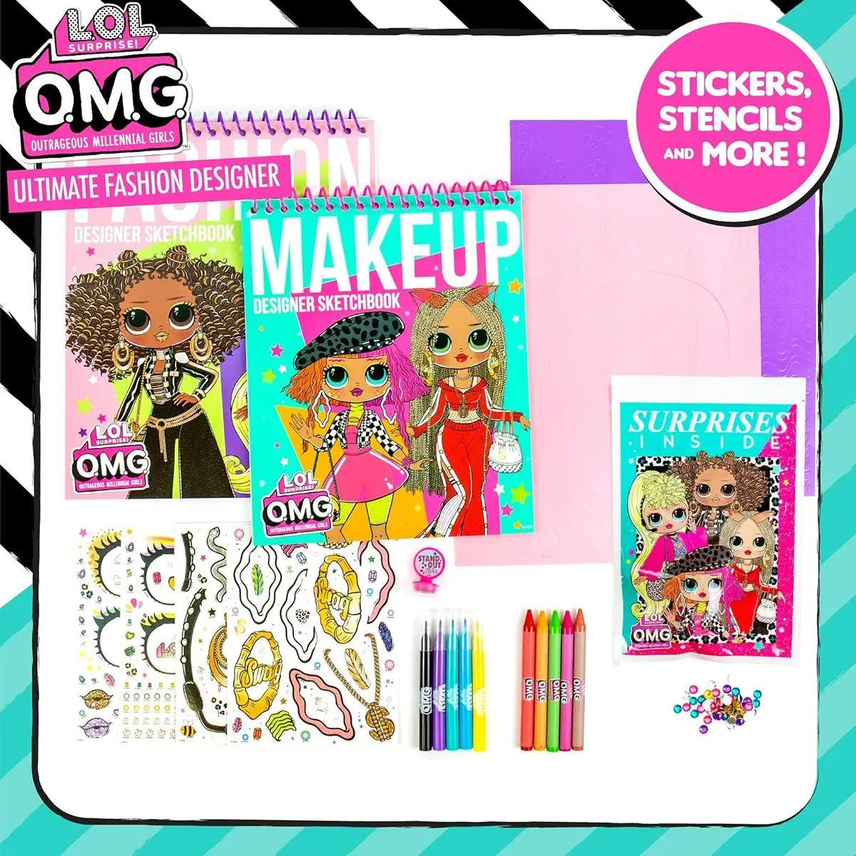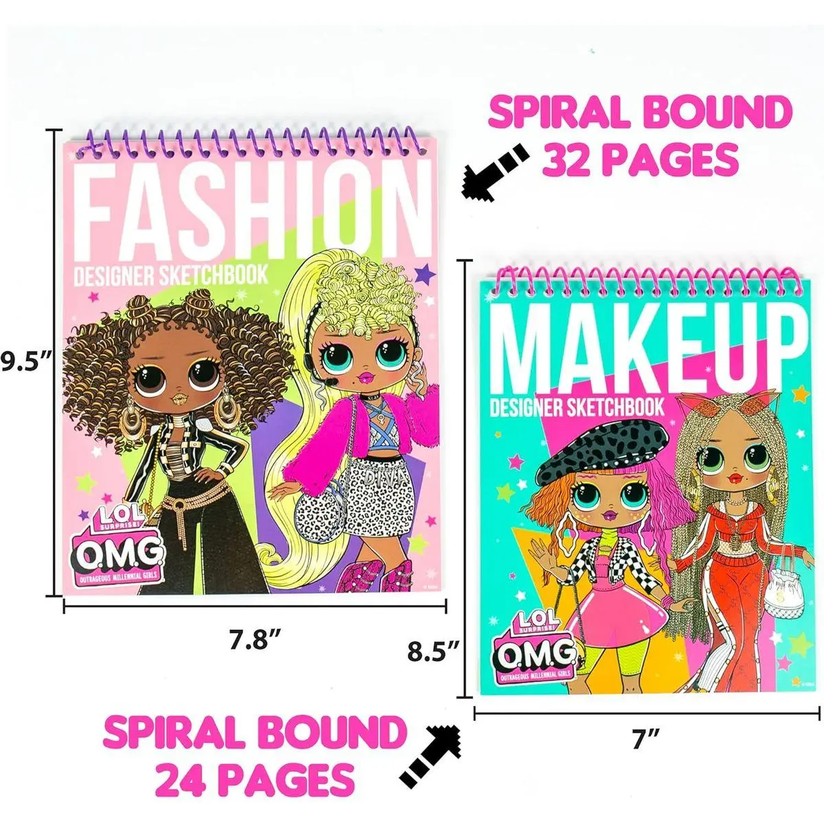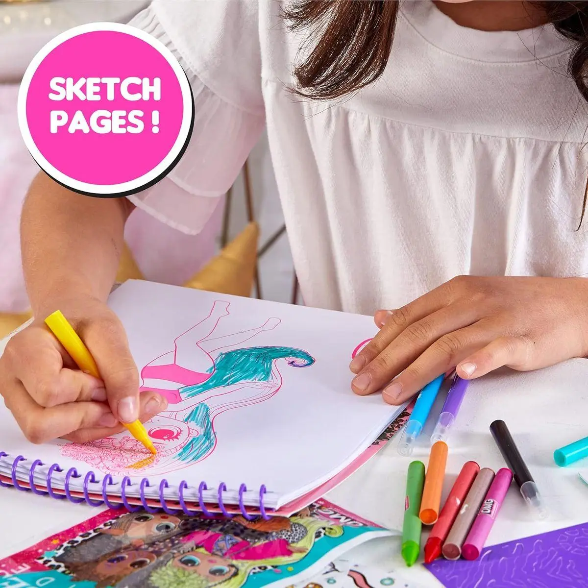 2 LOL SURPRISE OMG SKETCHBOOKS: Would you rather be a L.O.L. Surprise! O.M.G. fashion designer or make-up artist? With this 2-in-1 set, you can be both! Color & create your own outfits and make-up looks with a runway-inspired sketchbook and make-up designer sketchbook!