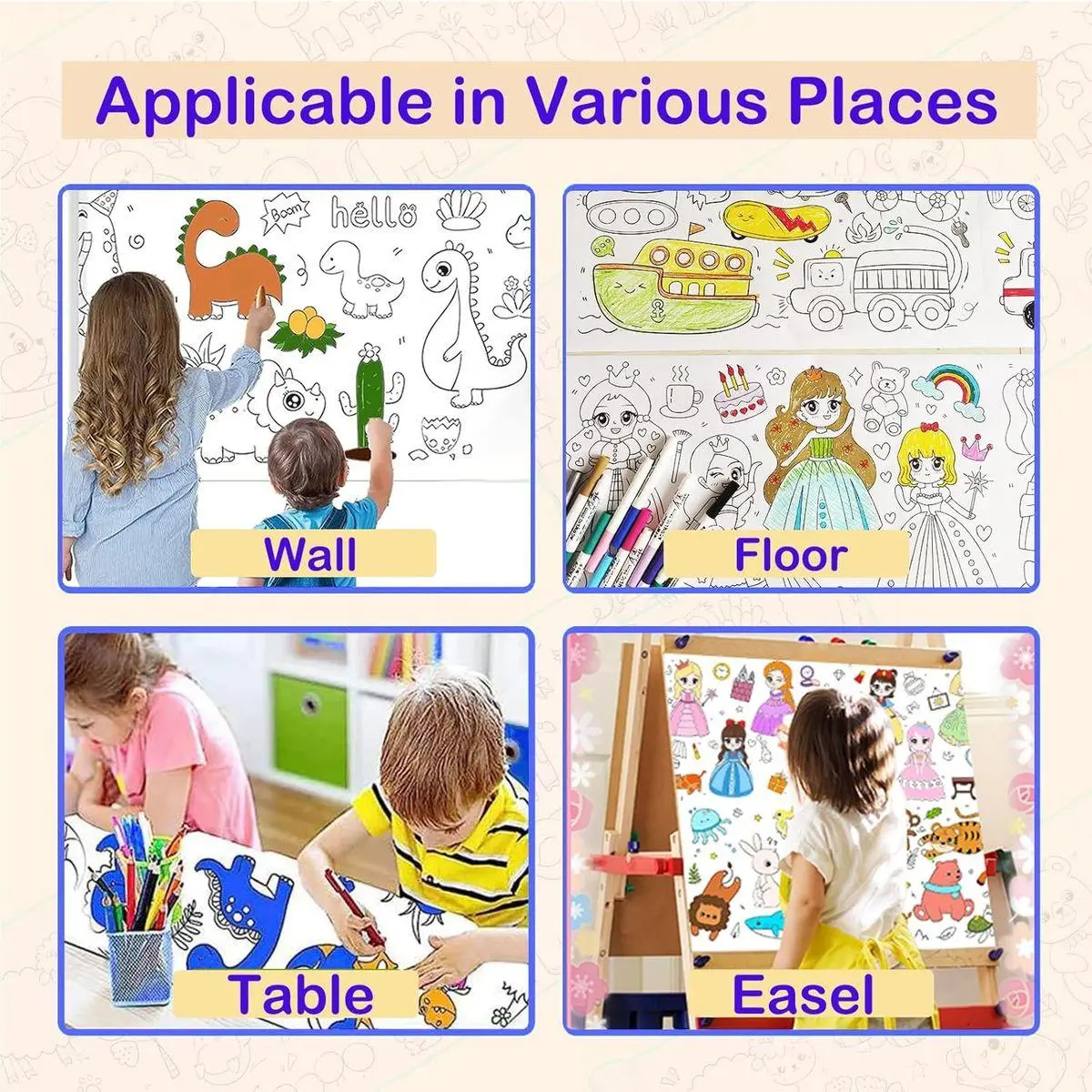 【Wide use】Our Sticky Drawing Paper Roll can be drawn with water colors, crayons, markers, colored pencils, placed on any flat and smooth surface. Ideal for kids' drawing lesson at kindergarten, family leisure game, children's party activity as single or group choice.