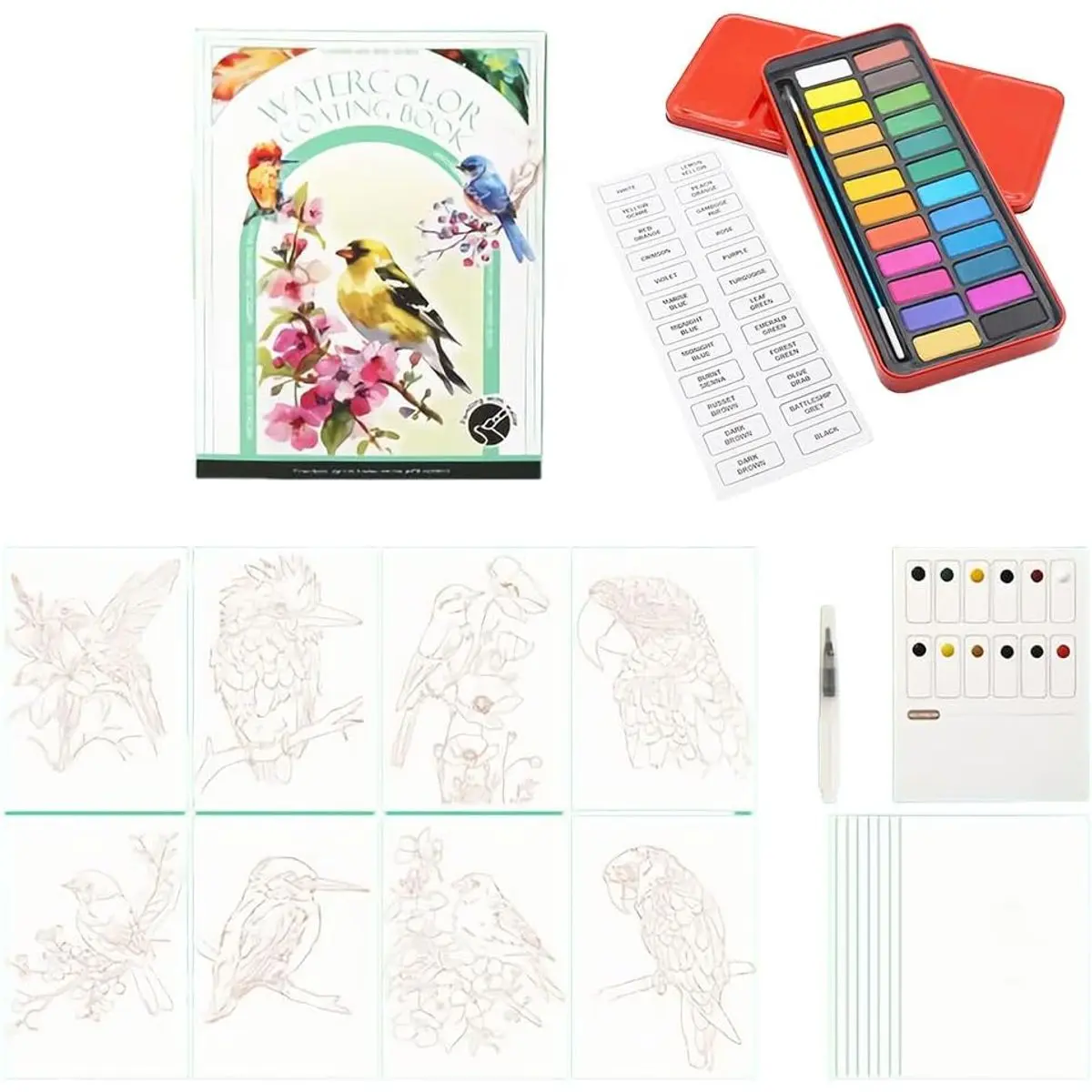 Included Components: 24-color solid watercolor palette, water pen brush, three-fold watercolor notebook, pre-drawn line art sketches, blank sheets for freehand creativity, durable metal watercolor tin