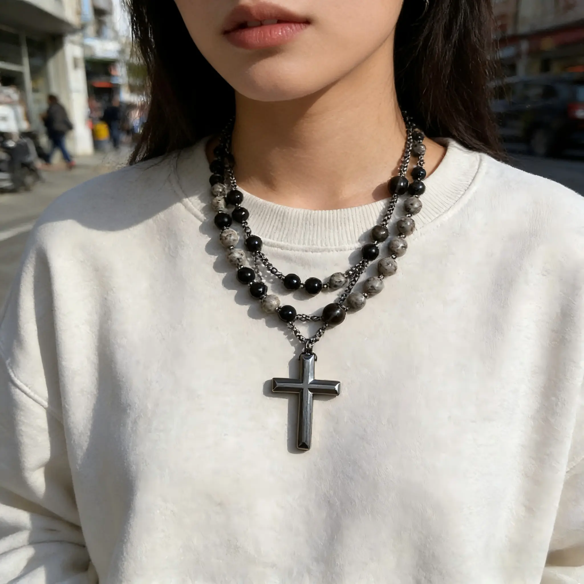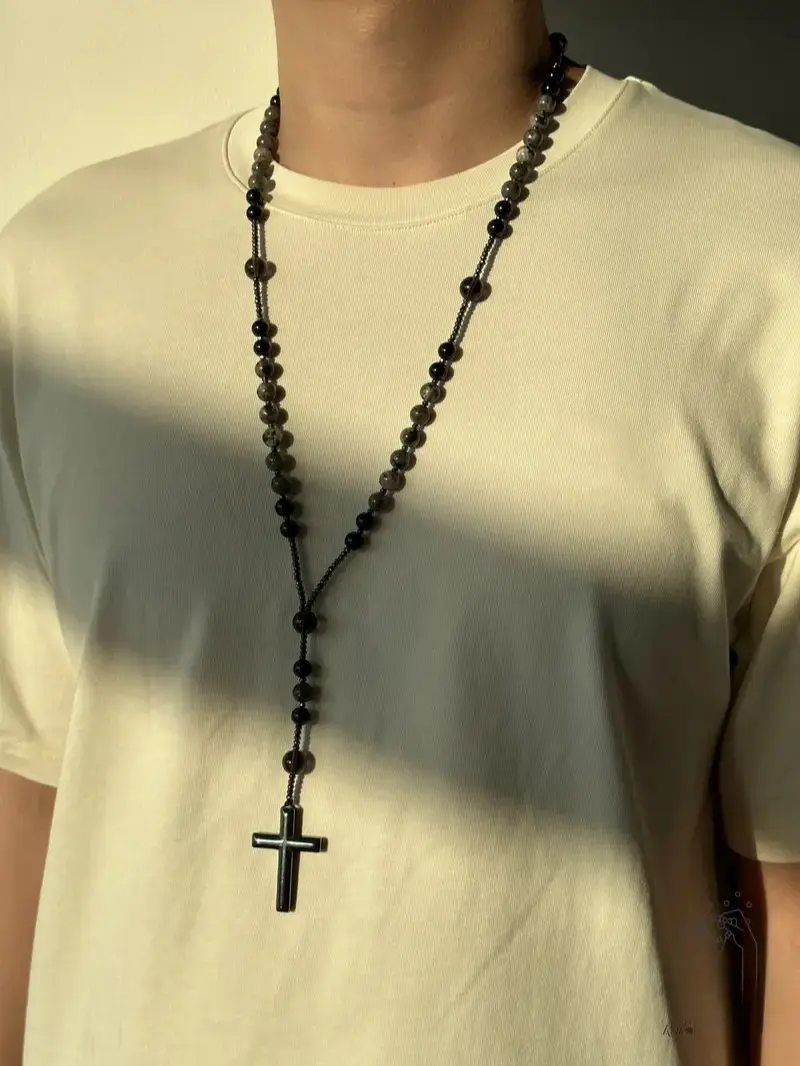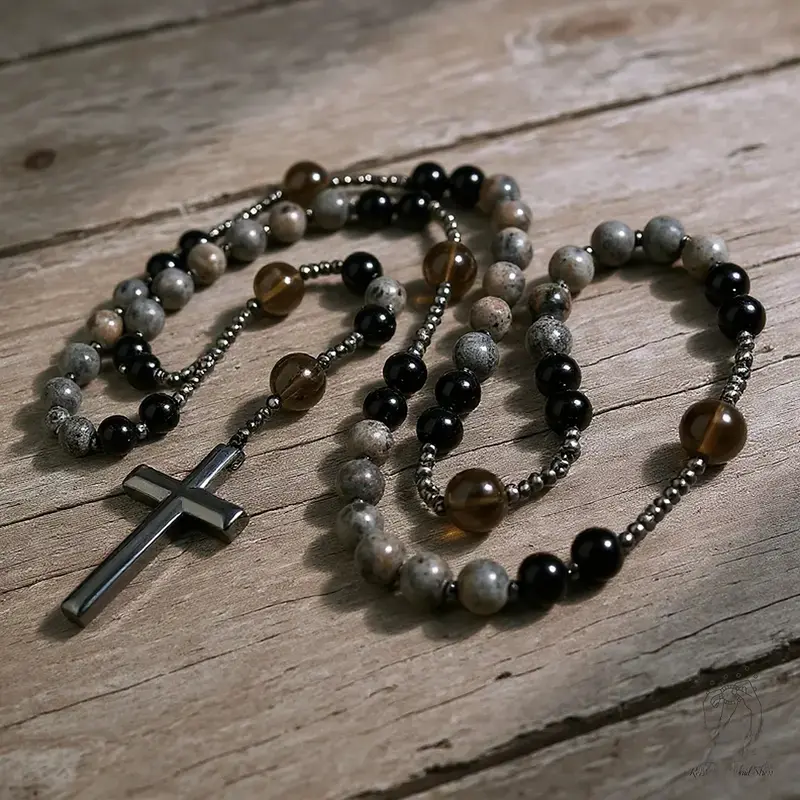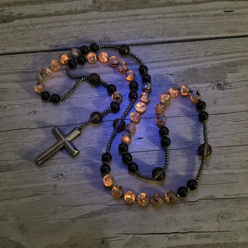 Natural Obsidian Uplite Rosary Necklace, UV-Reactive Protection Necklace, Hematite Cross Pendant Necklace, Perfect Gift for Her, Him, Boyfriend, Girlfriend, Husband, Wife, Dad, Mom, Friends