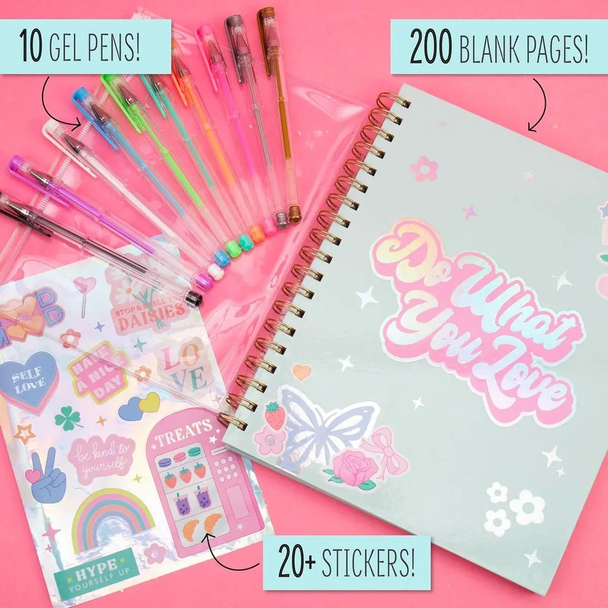 ALL-IN-ONE JOURNALING & SKETCH SET: This hardcover spiral-bound journal features 200 blank pages, colorful gel pens, and holographic stickers — it’s the ultimate canvas for all your ideas and to-dos!