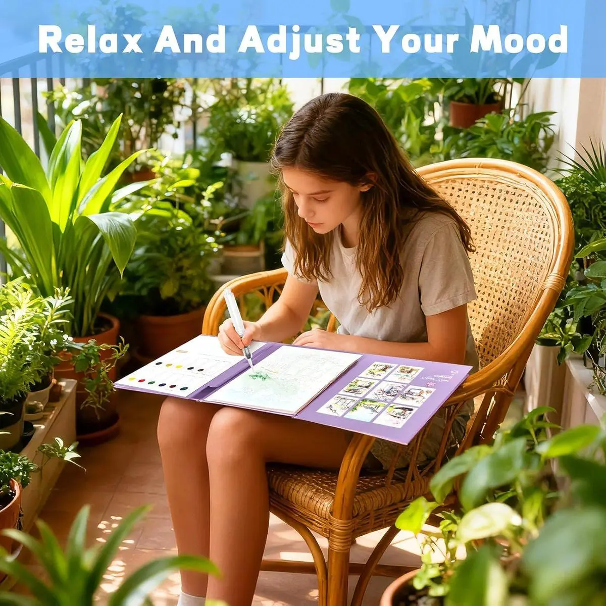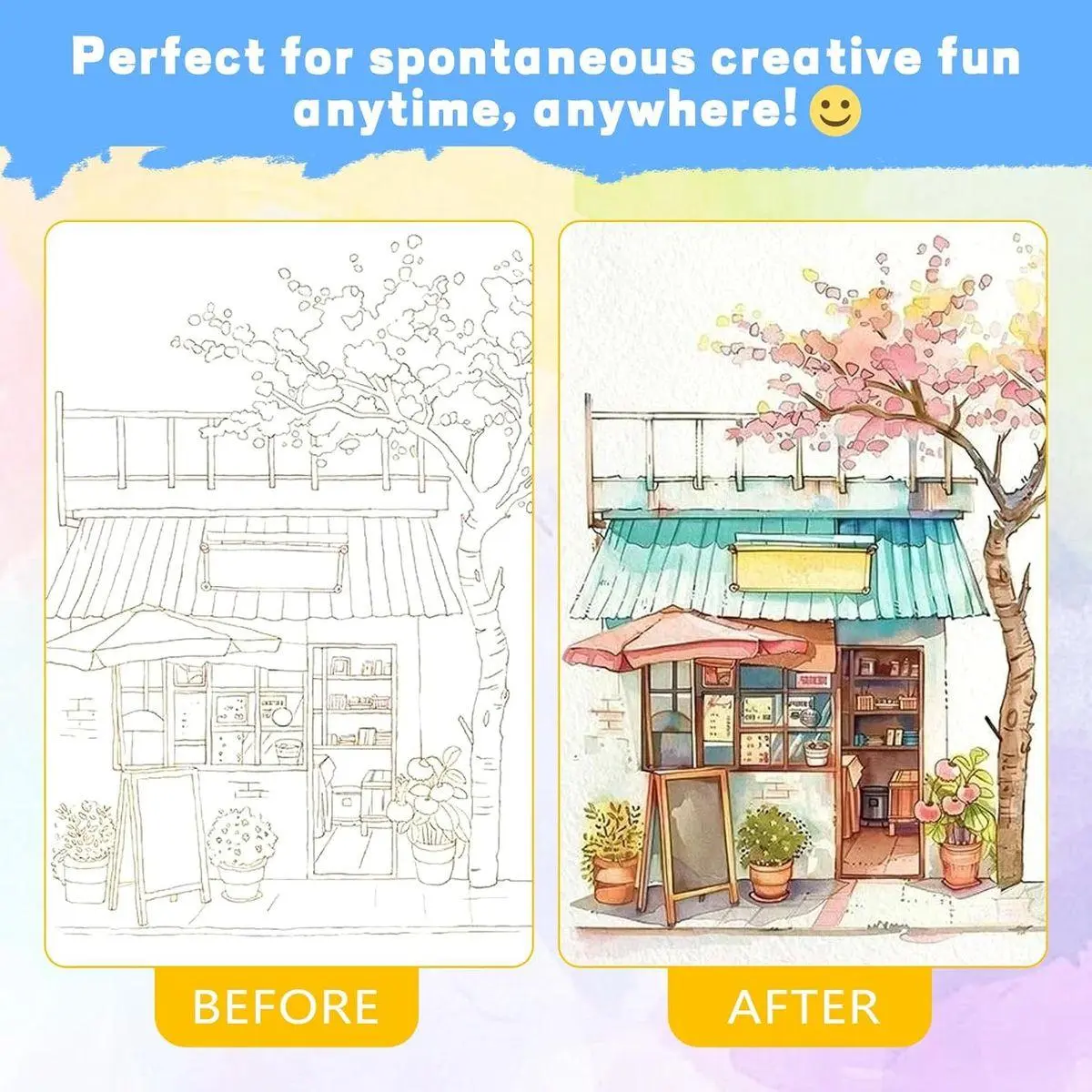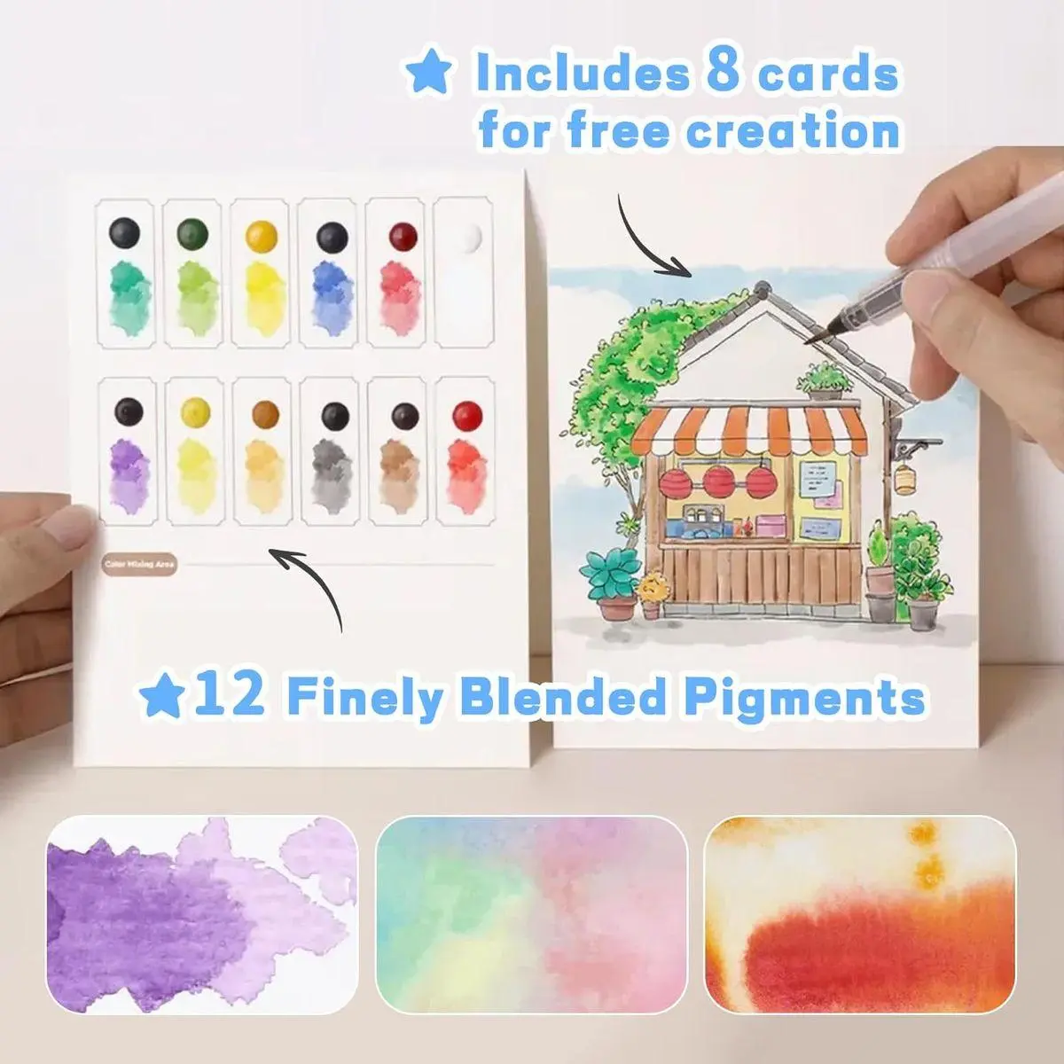 【All-in-One Creative Watercolor Kit】Includes 8 pre-printed painting pages, each with 12 embedded paint pans and a brush. Perfect for spontaneous creative fun anytime, anywhere—no setup required