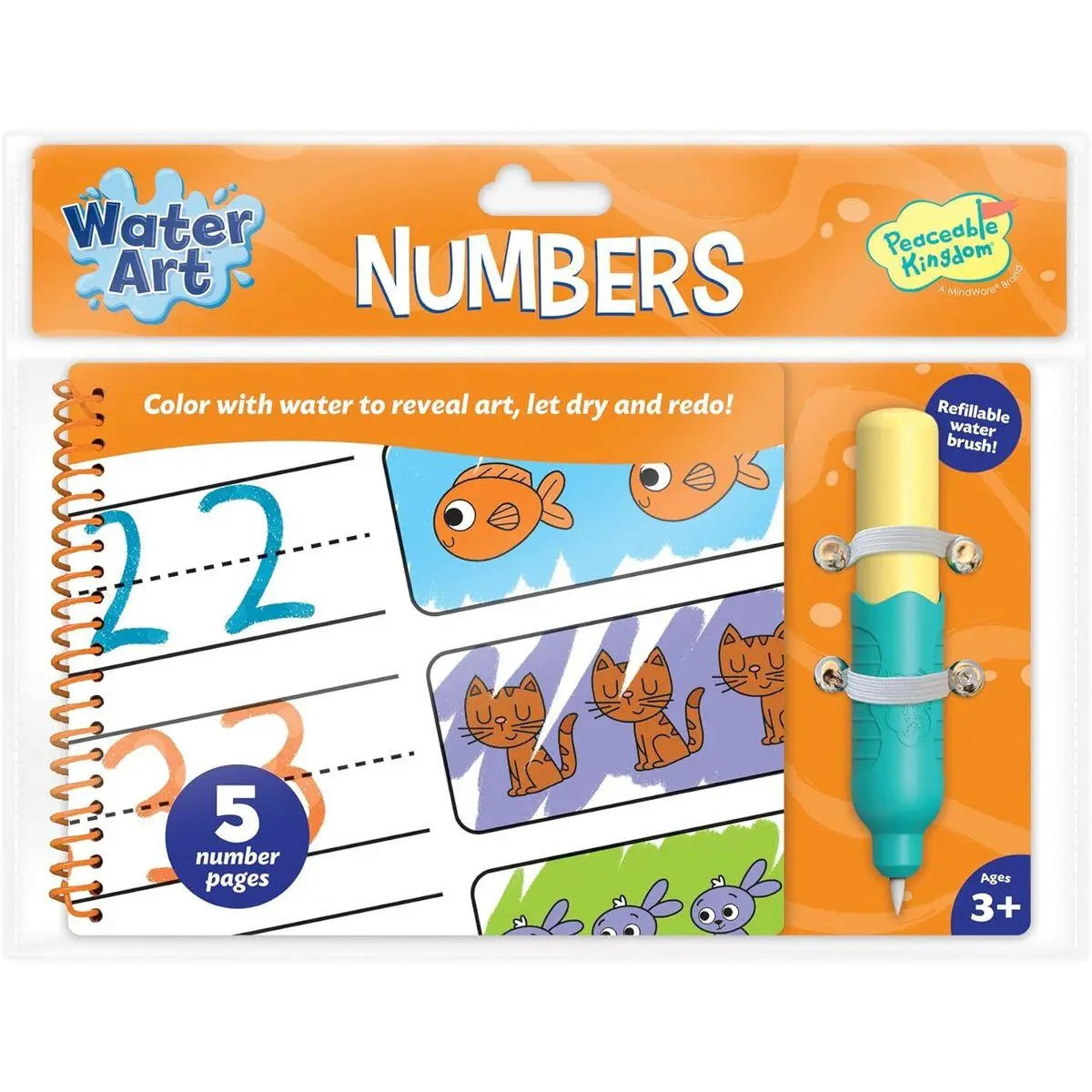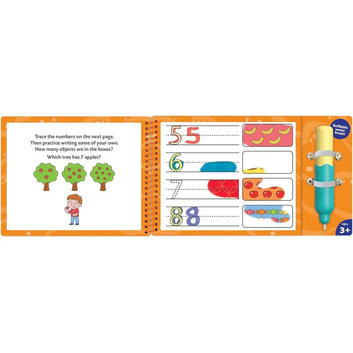 Reusable water brush pages reveal colorful numbers and pictures with simple strokes, letting kids trace count and explore math concepts while enjoying mess free creative play that resets after drying