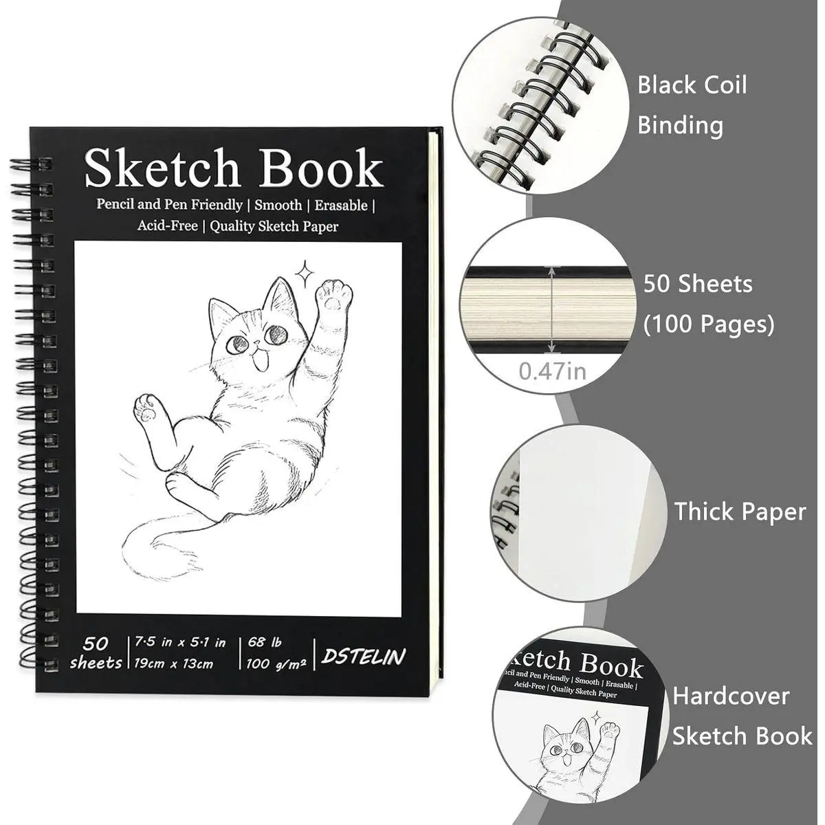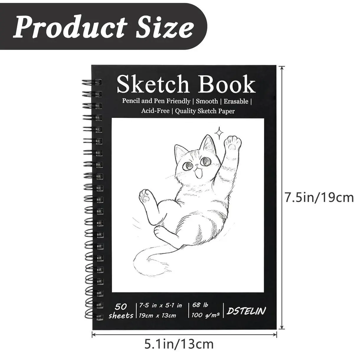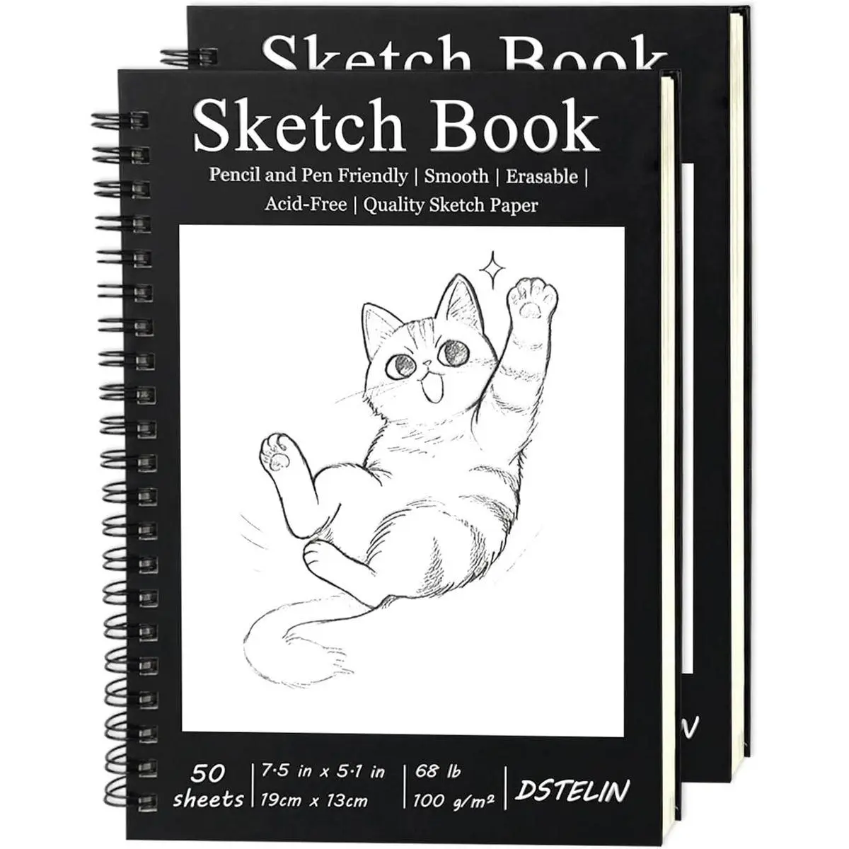 2-Pack DSTELIN mini Sketchbooks with Cat Art: Spiral-bound, landscape-oriented (7.5 x 5.1 in / 19 x 13 cm) with sleek black hardcovers, each featuring an adorable hand-drawn cat illustration for a stylish whimsical touch.