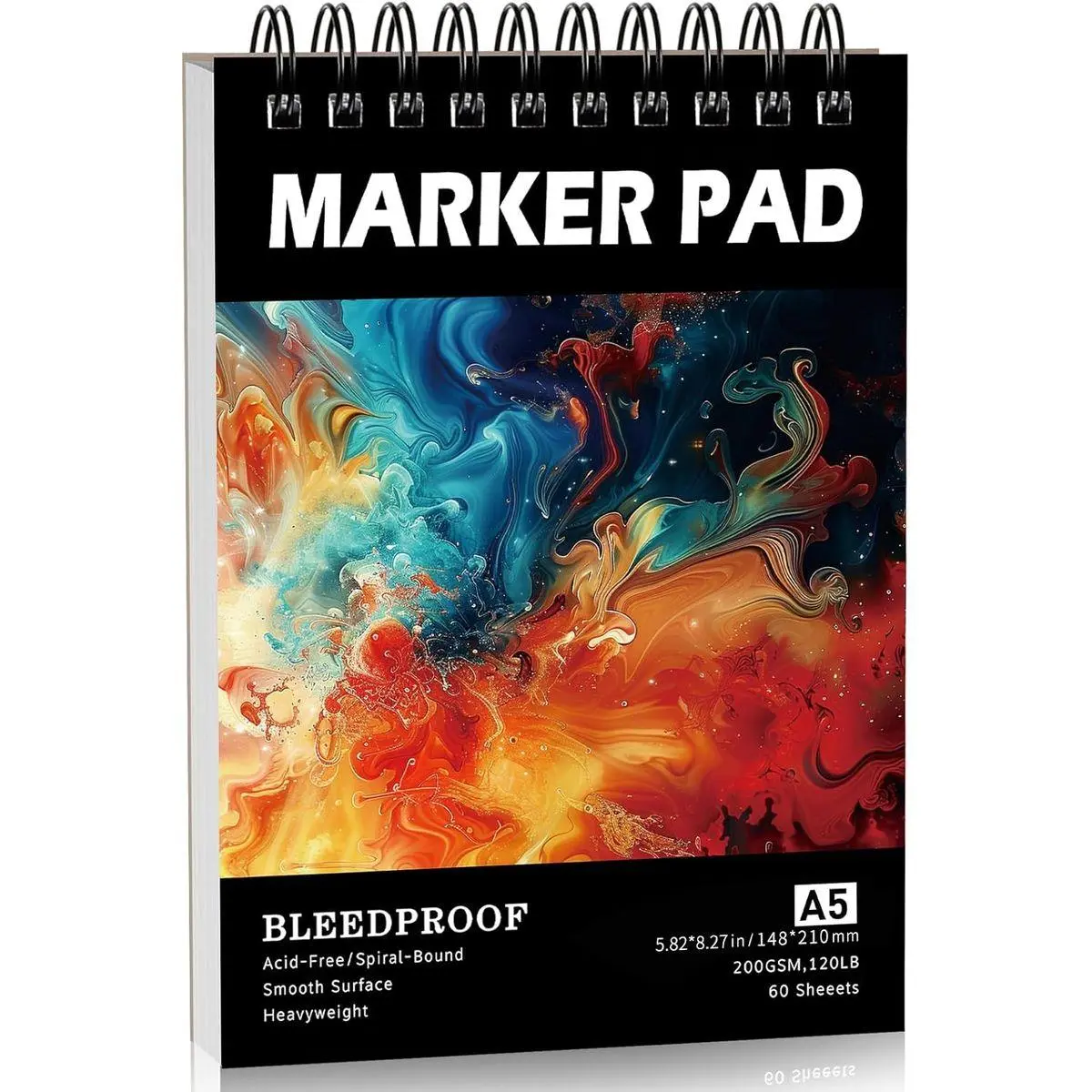 【Premium Marker Paper Pad】1 professional marker pad (5.8"×8.3") with 60 sheets of 200gsm acid-free marker paper. Anti-bleed coating prevents 99% of ink from seeping through, perfect for alcohol markers, light watercolors, and layered blending. Compact A5 size fits in folders or backpacks