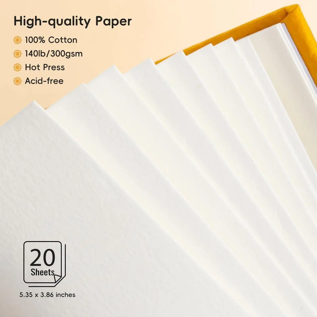 Premium Quality Paper: This watercolor sketch book features 20 sheets of 300gsm (140lb) hot-pressed paper. Made from 100% cotton and acid-free, the paper ensures durability and long-lasting quality, perfect for professional artists and beginners alike.