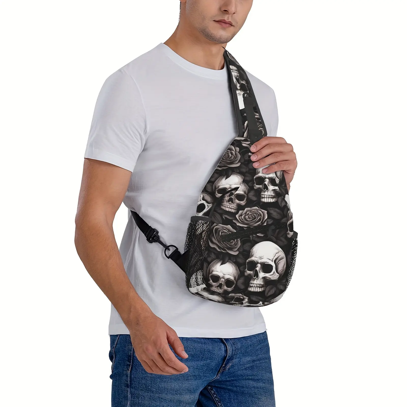 A Versatile Crossbody Chest Bag Designed for Hiking, Featuring a Skull White Roses Pattern. This Folding Backpack Offers Ample Storage Is Stylishly Durable, Suitable for Shopping, Work, Travel, Beach Outings, Fishing, Halloween, School and