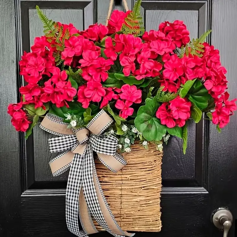 Spring Summer Geranium Artificial Flower Basket Wreath, Plaid Ribbon, Farmhouse Style Door Decor, Mother's Day Decoration