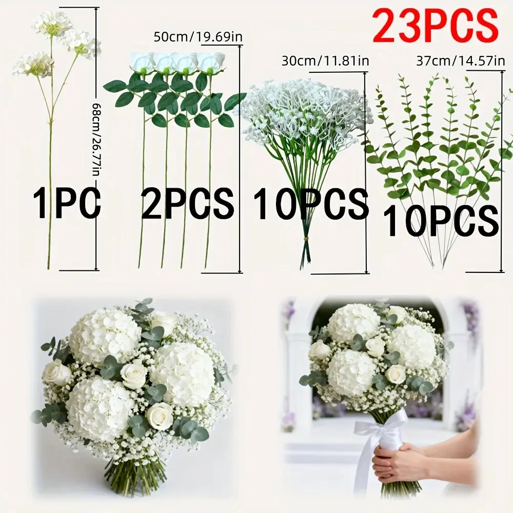 Elegant White Artificial Flower Bouquet Hydrangea Rose Baby's Breath Eucalyptus Artificial Flower Arrangement