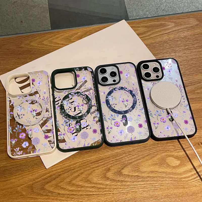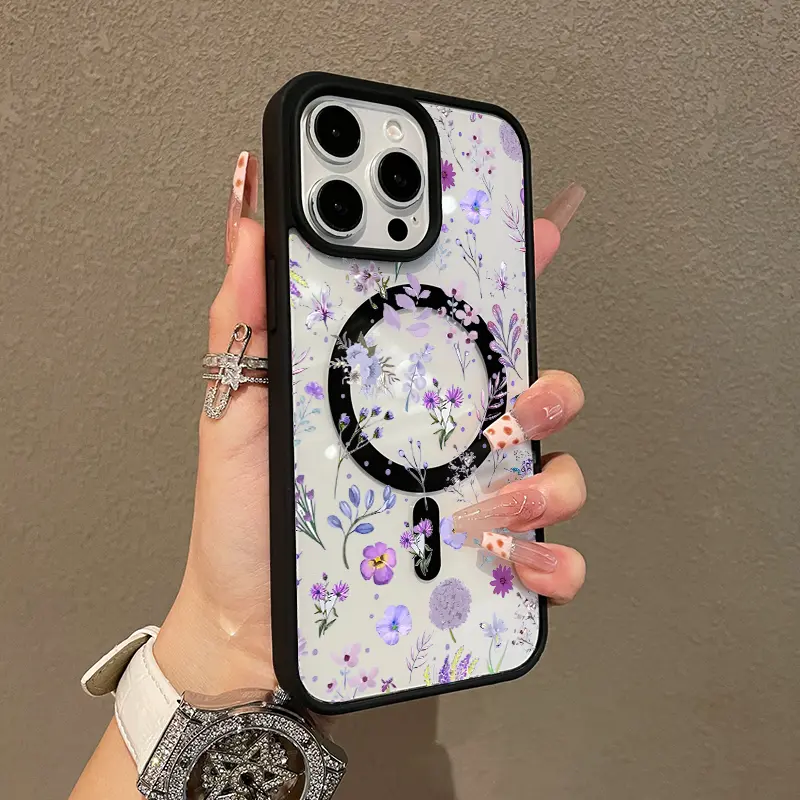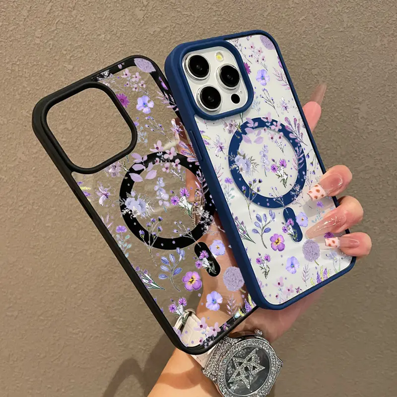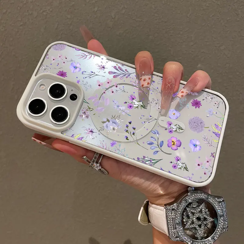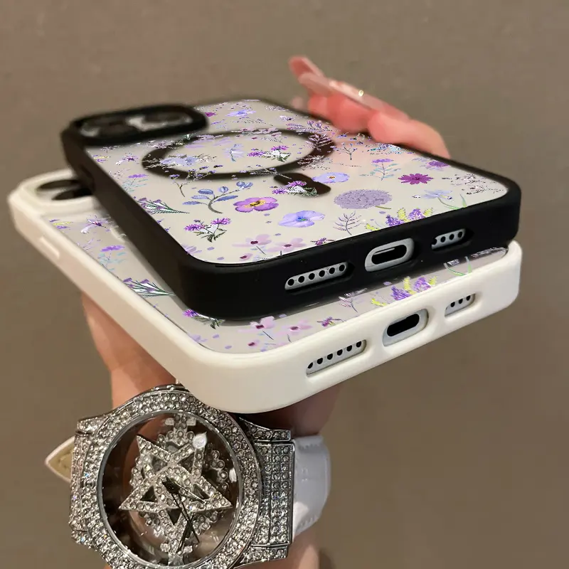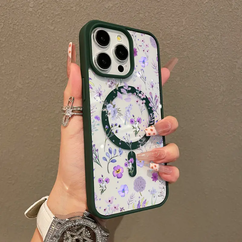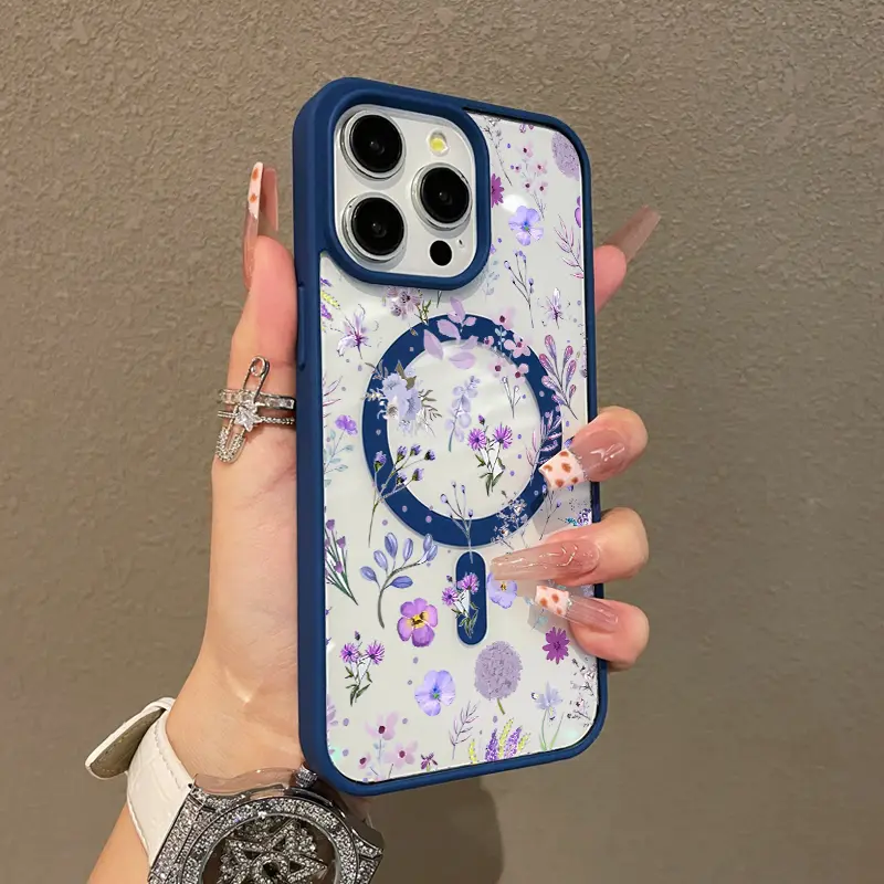 Magnetic Silicone Case for iPhone 17 16 15 14 13 12 11 Pro Max Plus XS XR Purple Floral Aesthetic Shockproof Lightweight Girly Scratch Resistant Protection