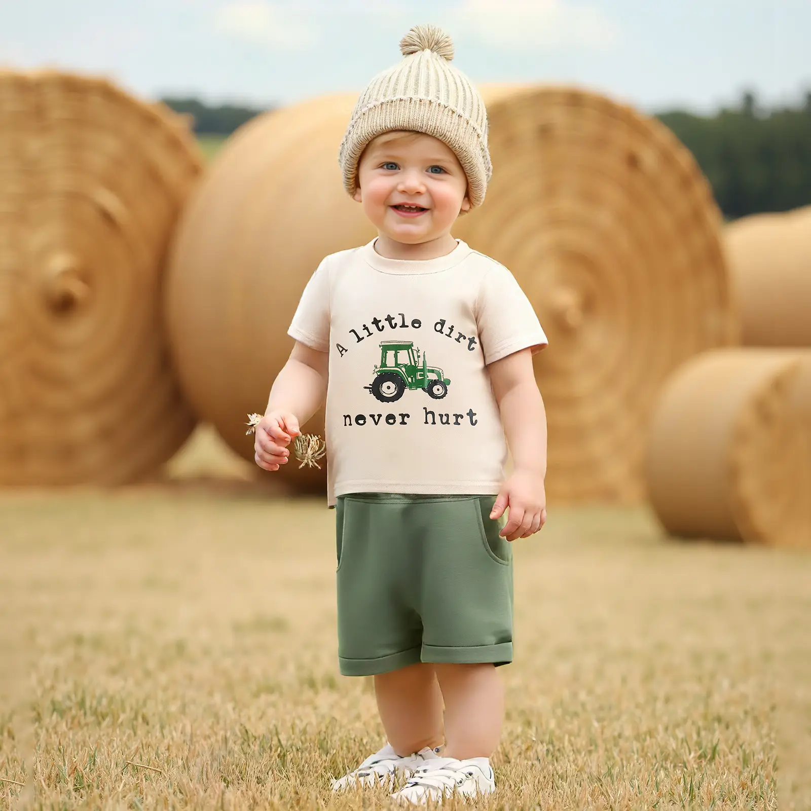 Toddler Boy Shorts Set Letter Tractor Print Short Sleeve Round Neck T-Shirt with Solid Shorts 2Pcs Outfit