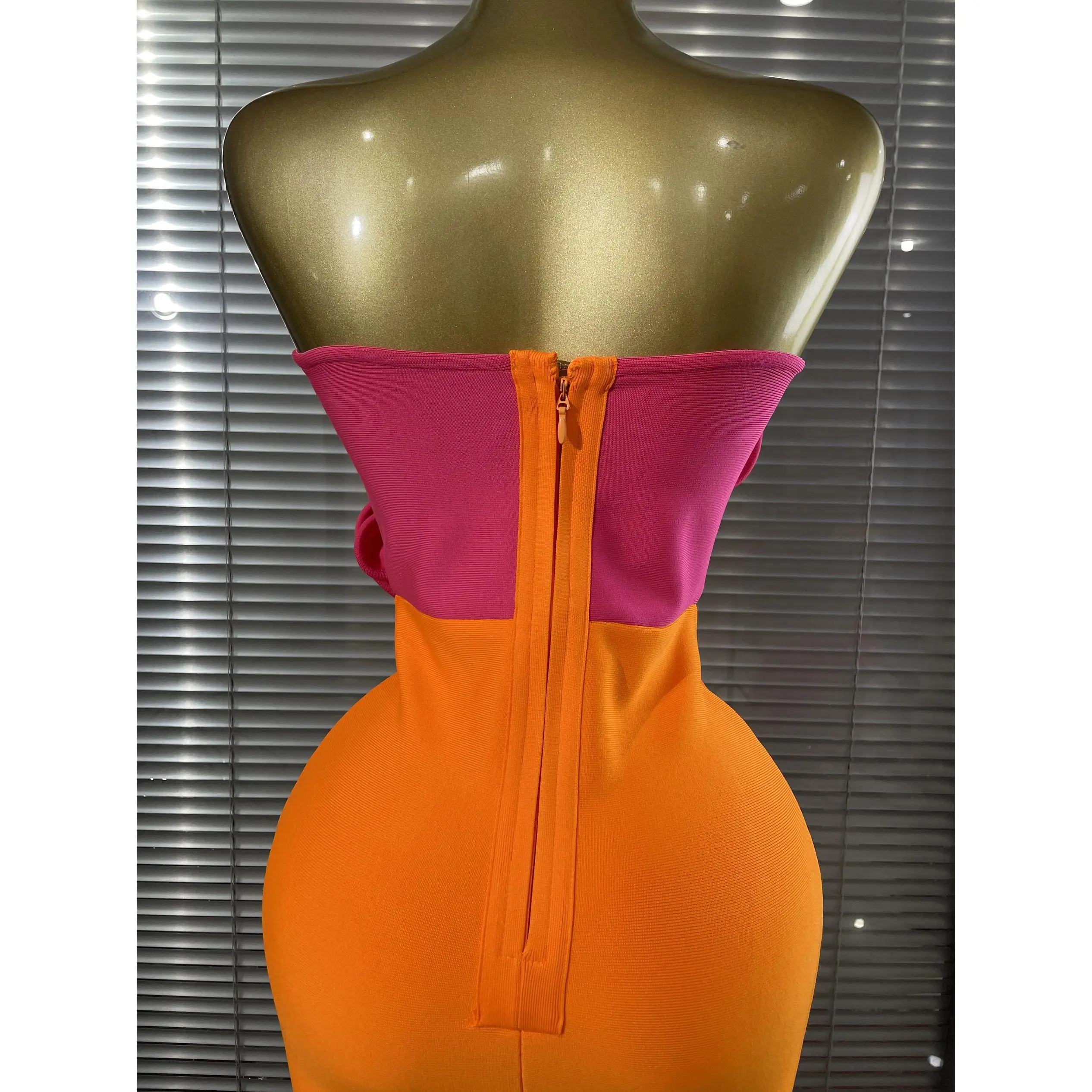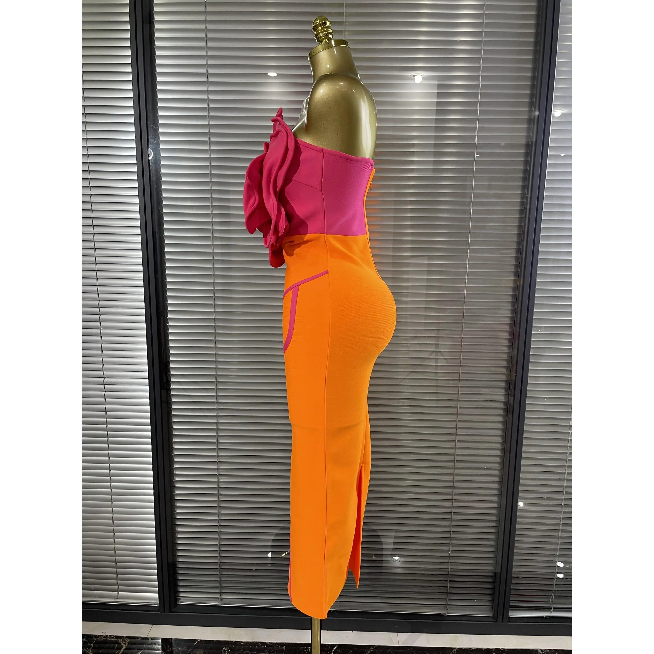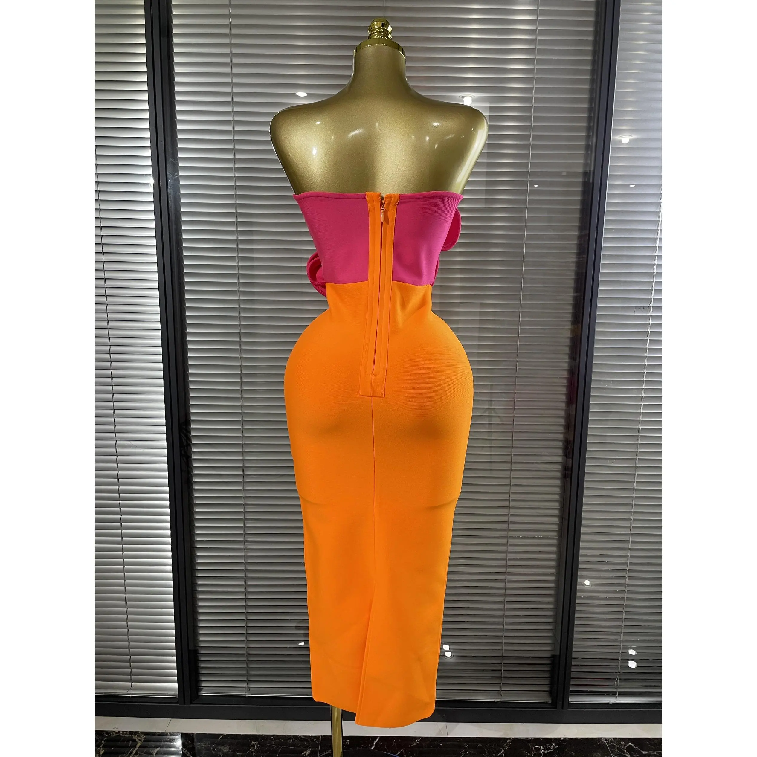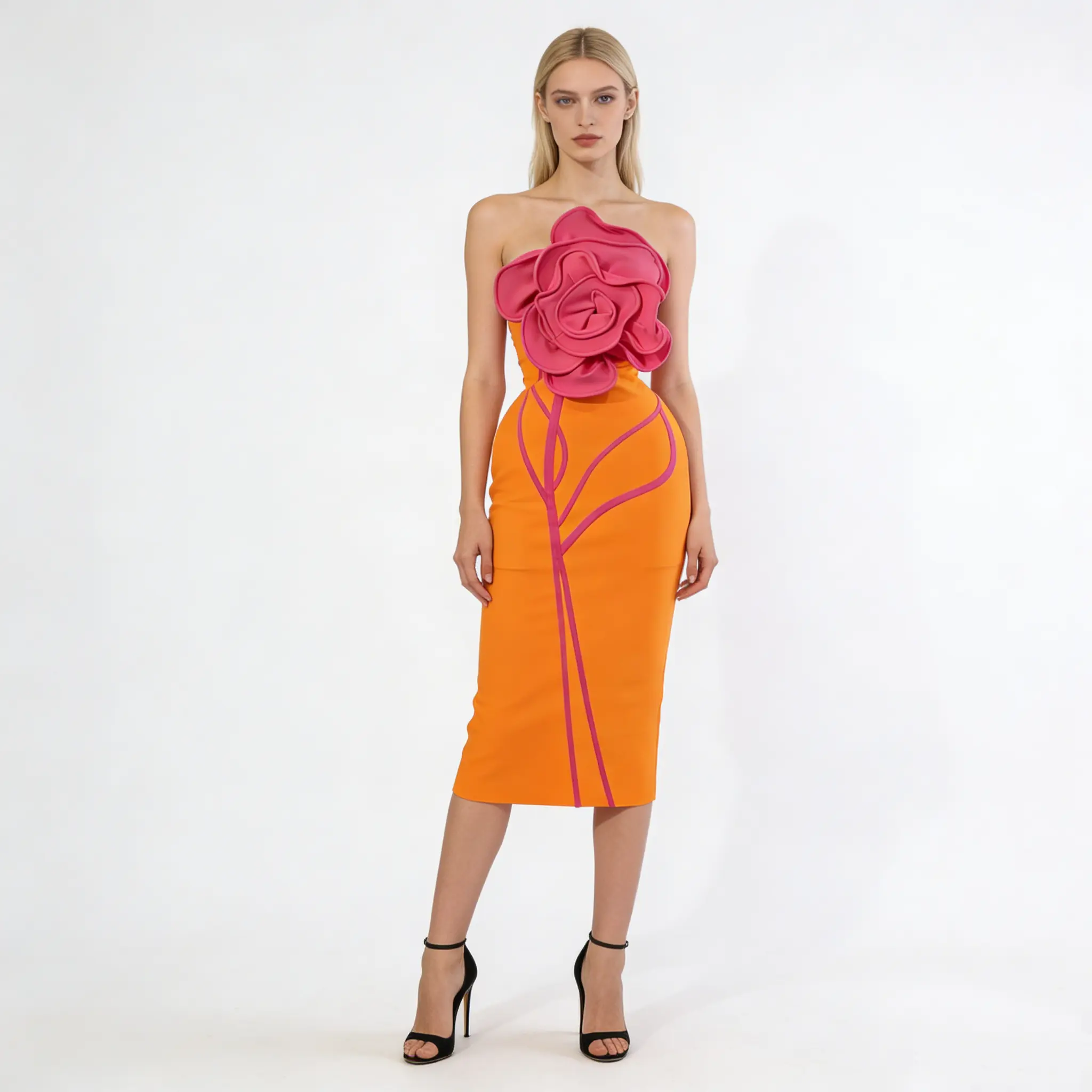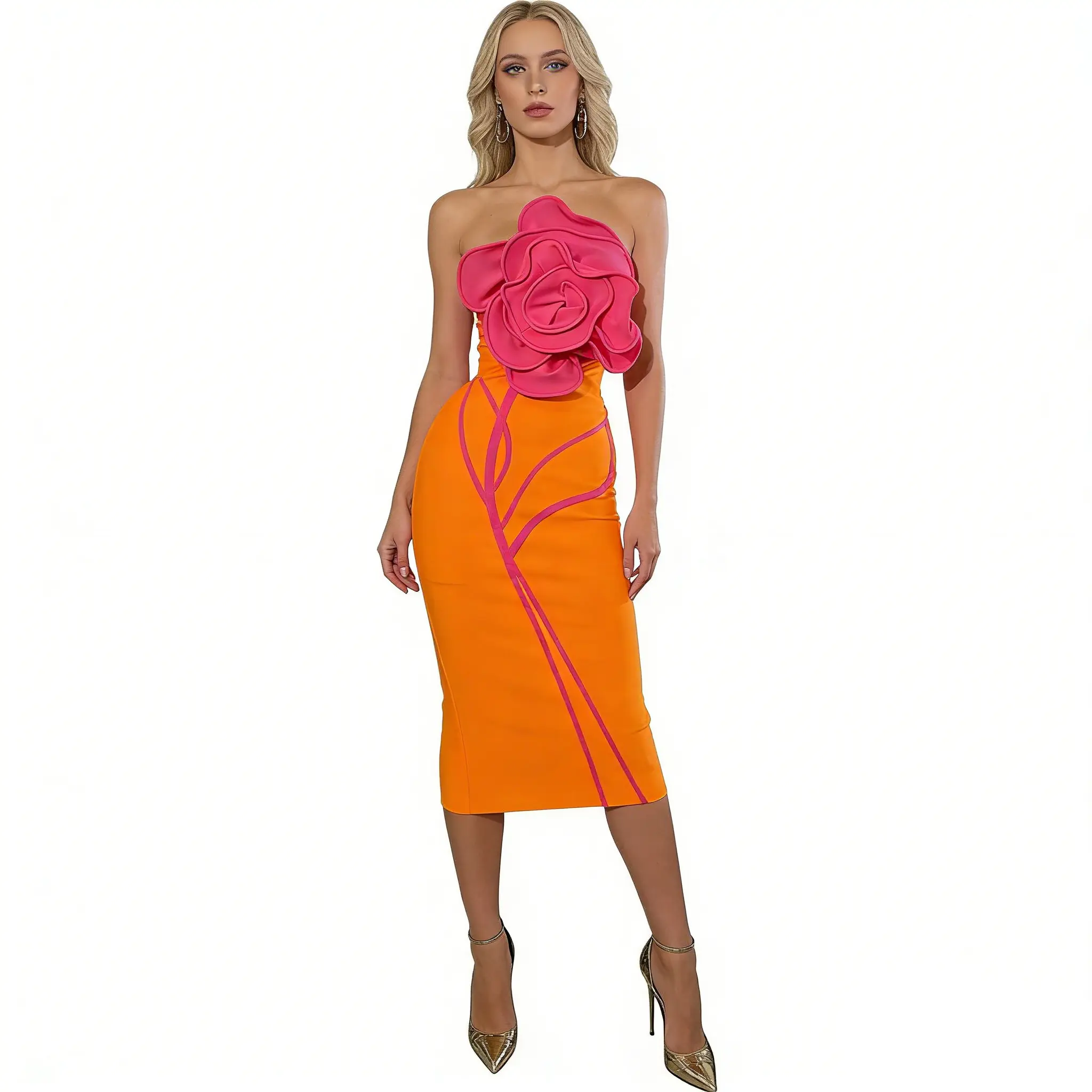 Crafted from premium stretch bandage fabric, this dress hugs your curves in all the right places, delivering a flawless, sculpted silhouette that flatters every inch of your figure.The vibrant orange base is elevated by eye-catching hot pink 3D rose appliqué at the bust, paired with matching pink stem detailing that adds a playful, artistic twist to the classic bandage style.The strapless neckline showcases your shoulders and collarbone, while the midi length strikes the perfect balance between elegance and modernity, making it ideal for cocktail parties, date nights, club events, weddings, or any occasion where you want to turn heads.