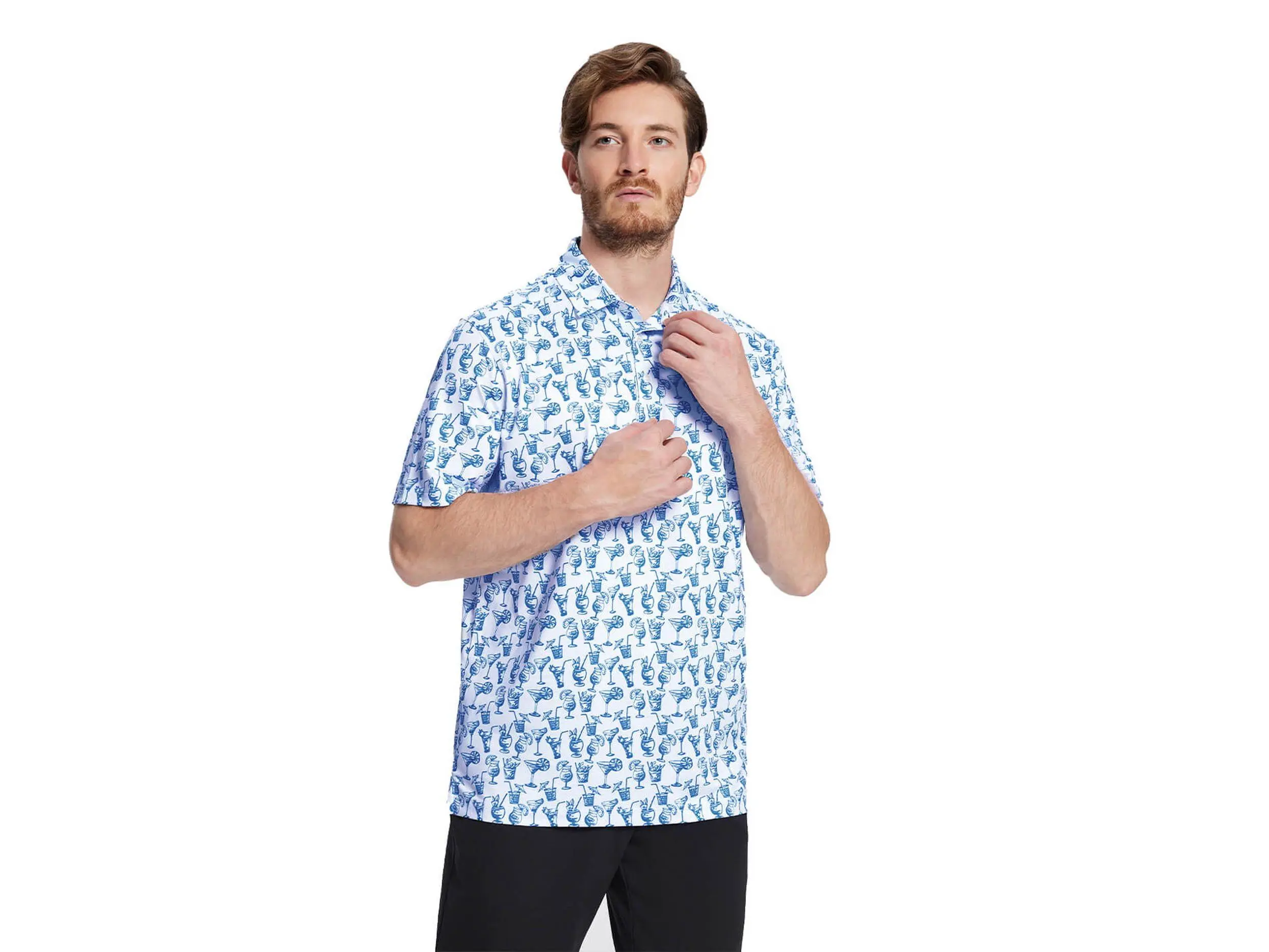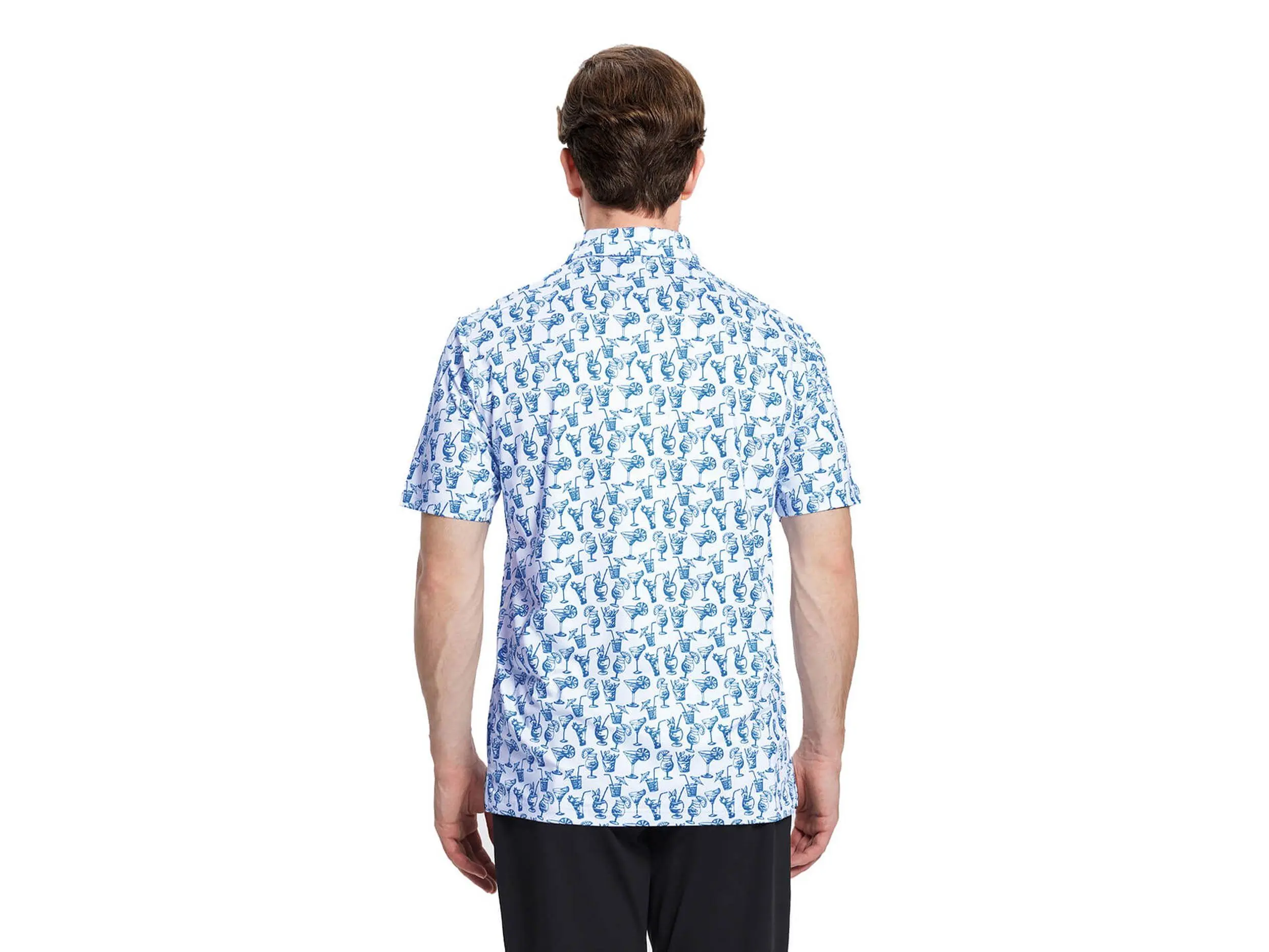 Introducing the DTWOOO Brand Summer Drink Men's Print Performance Polo. Stay cool and stylish with this moisture-wicking polo, featuring a fun print design. Experience comfort and performance in one shirt. Elevate your summer wardrobe with DTWOOO.