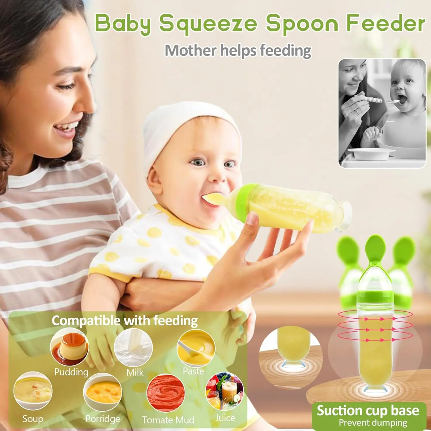 ·【3 oz Squeeze Feeding Spoons】:Squeezable baby spoon bottle feeder with scale ensures accurate measurement and reduces spillage.Dispenses baby food one bite at a time for convenient one-handed feeding. Spoon feeder improves hand-eye coordination and fine motor skills.