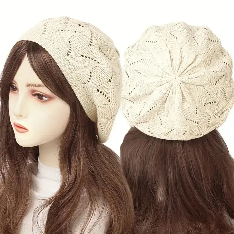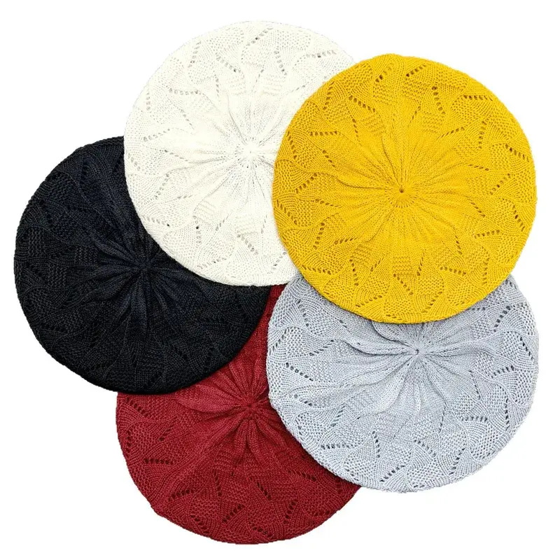 Women Hollow Out Knitted Beret Hat Spring Autumn Elastic Crochet Beanies for Lady Casual Solid Color Painter Artist Caps