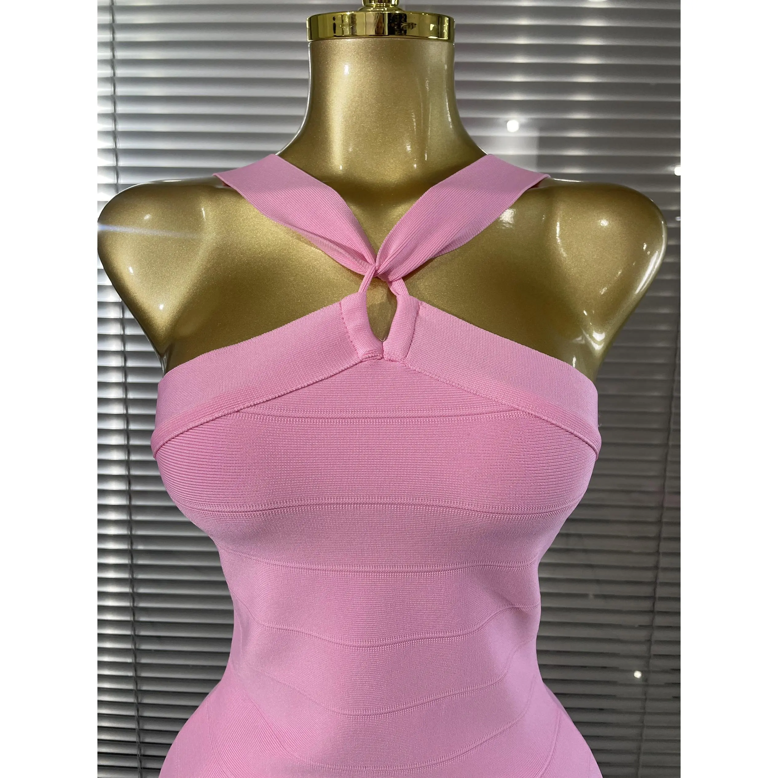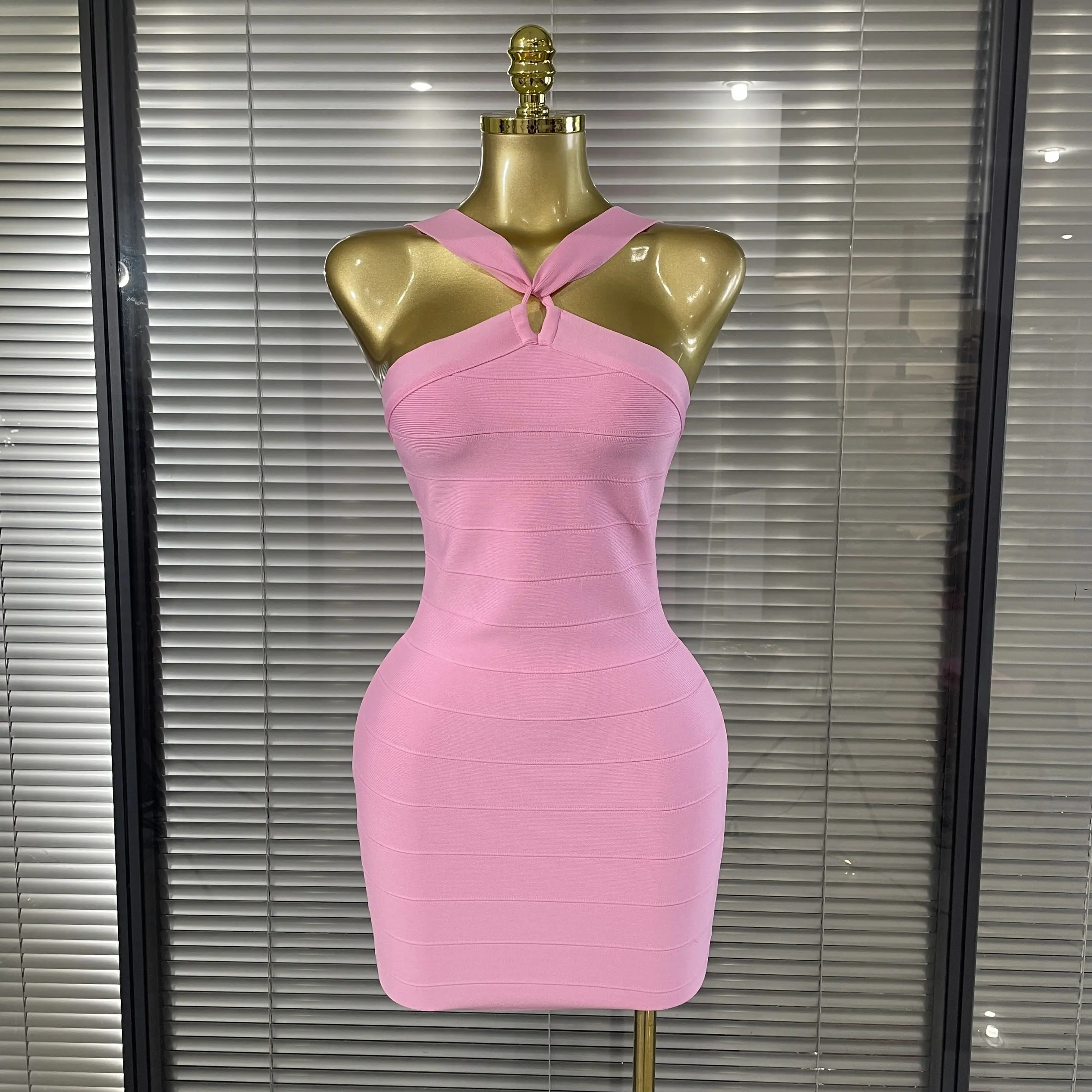 Step into ultimate glamour with this must-have pink cross halter bandage mini dress, designed for the modern fashionista who loves to stand out.