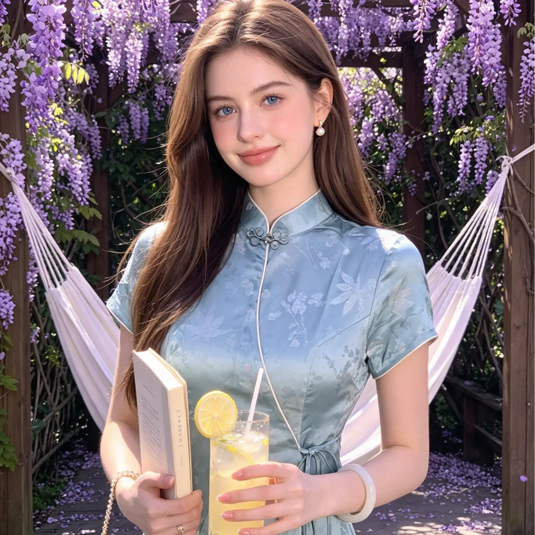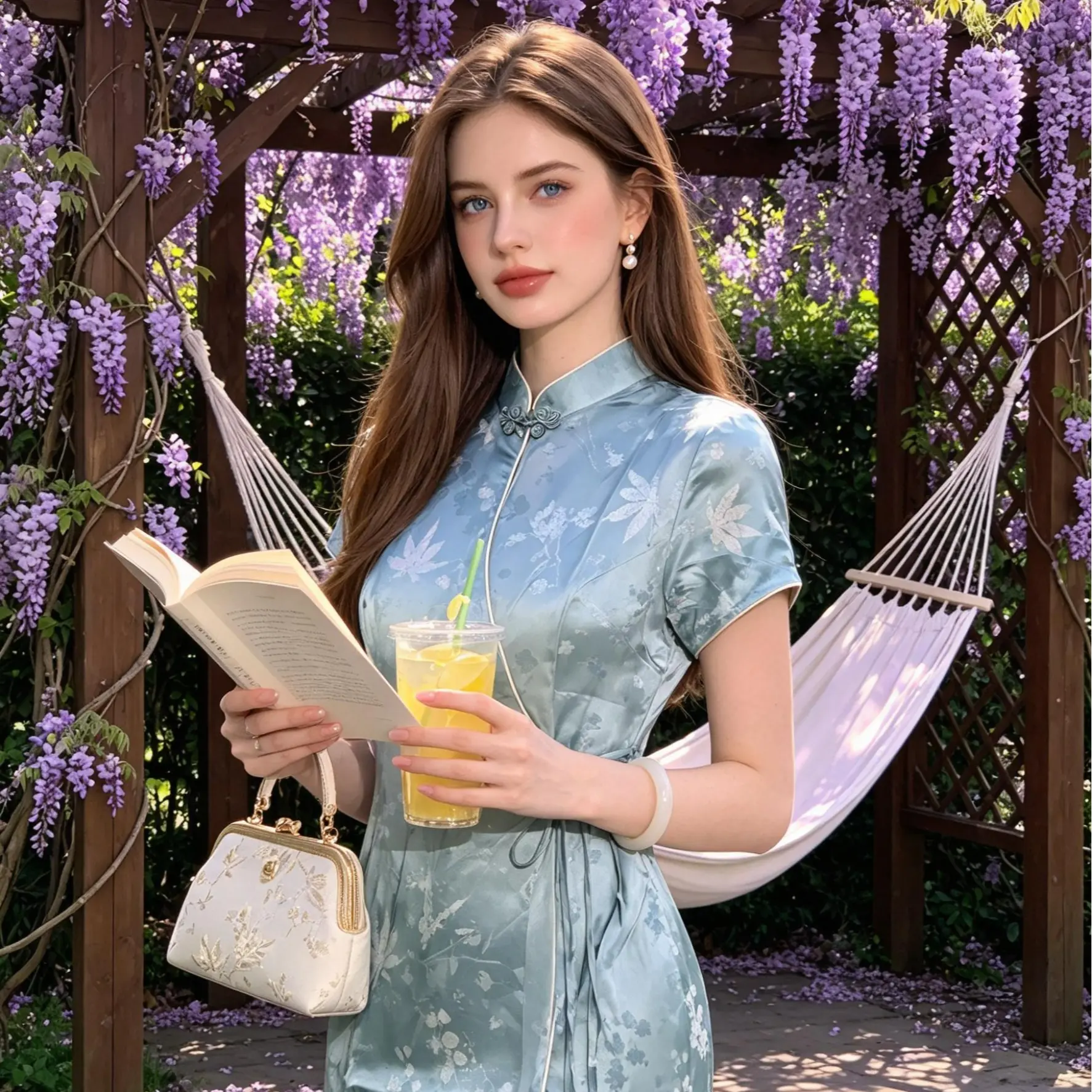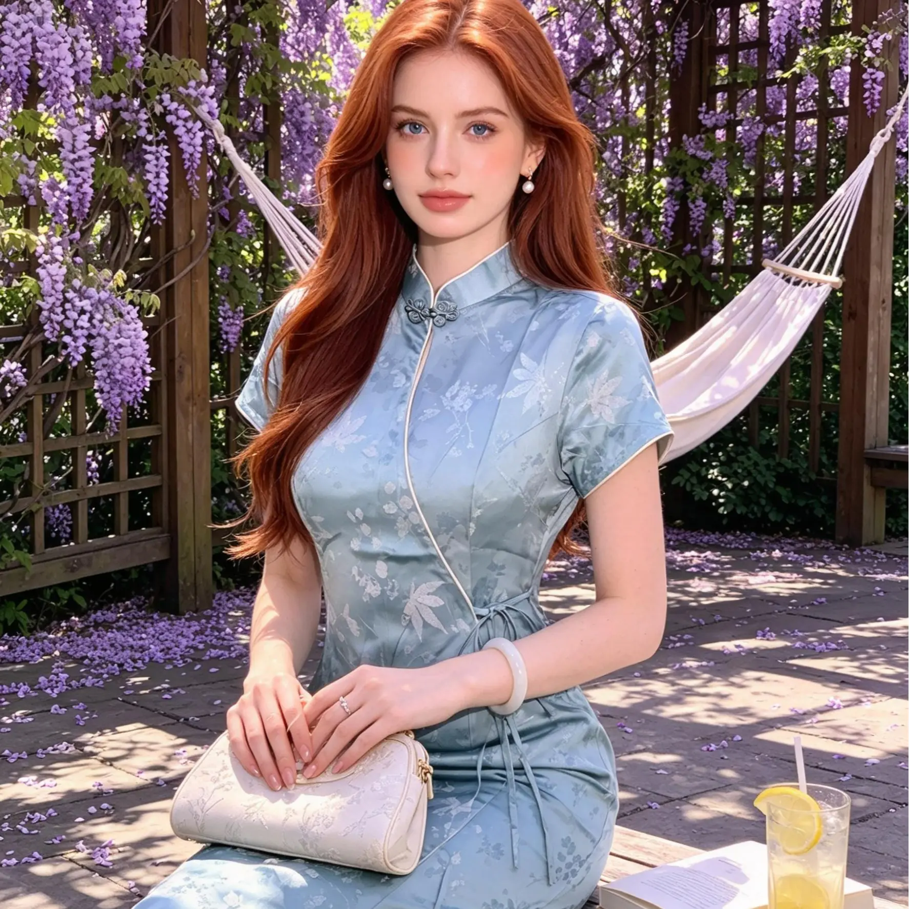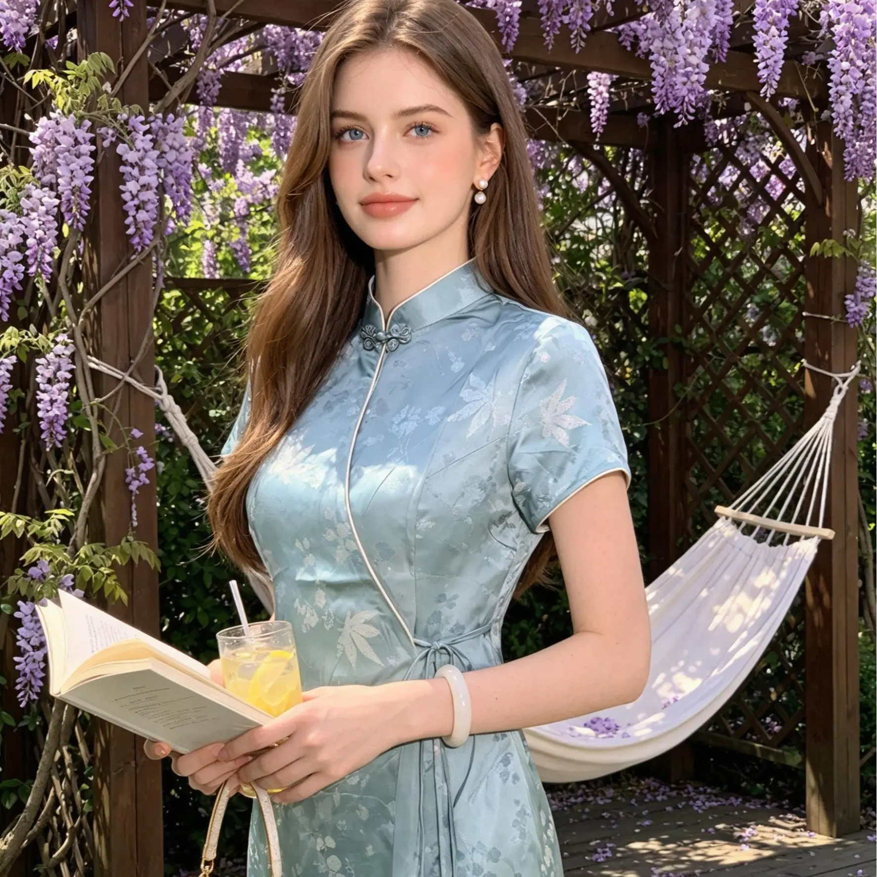 Set against a soft celadon background, this qipao features a silky jacquard fabric with subtle maple leaf and foliage patterns that shimmer like moonlit water. The modern wrap-front tie closure replaces traditional frog buttons for easy wear and a relaxed vibe, while the cream trim on the short sleeves adds a touch of gentle warmth to the cool-toned satin. The slit hem and flowing fabric move gracefully with every step. Ideal for spring/summer outings, beach getaways, casual gatherings, or days you want to elevate your everyday look. Its cool palette and soft tailoring make it an effortless way to embody modern Chinese elegance.