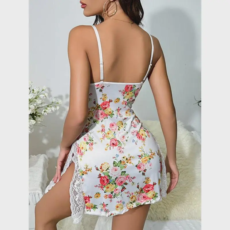New Lady Floral See Through Sexy Slip Dress Mesh Cute Girls Sexy Nightwear Sleep Dress Lingerie Lace Suspension Dress Set