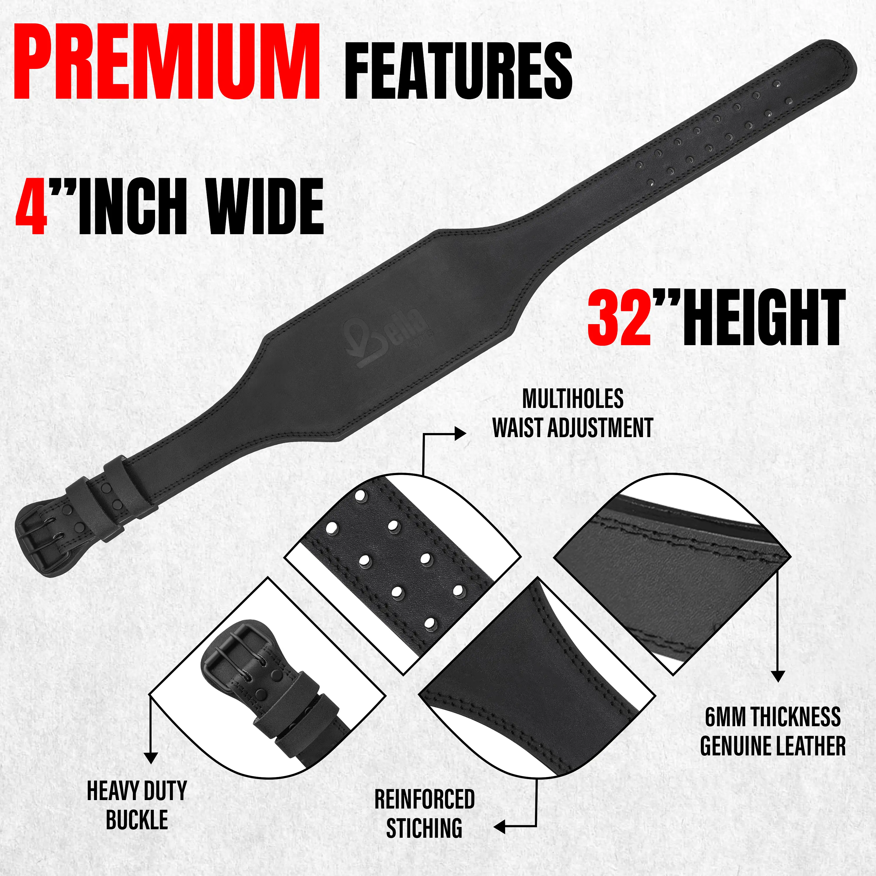 Upgrade your strength training with this premium leather weightlifting belt designed for serious lifters. Made from durable cowhide leather, this belt offers superior support and stability for your lower back during heavy lifts like squats and deadlifts.The 4-inch wide padded design ensures even pressure distribution, reducing injury risk while improving lifting performance. Featuring a heavy-duty steel double prong buckle and reinforced stitching, this belt is built for durability and long-term use.