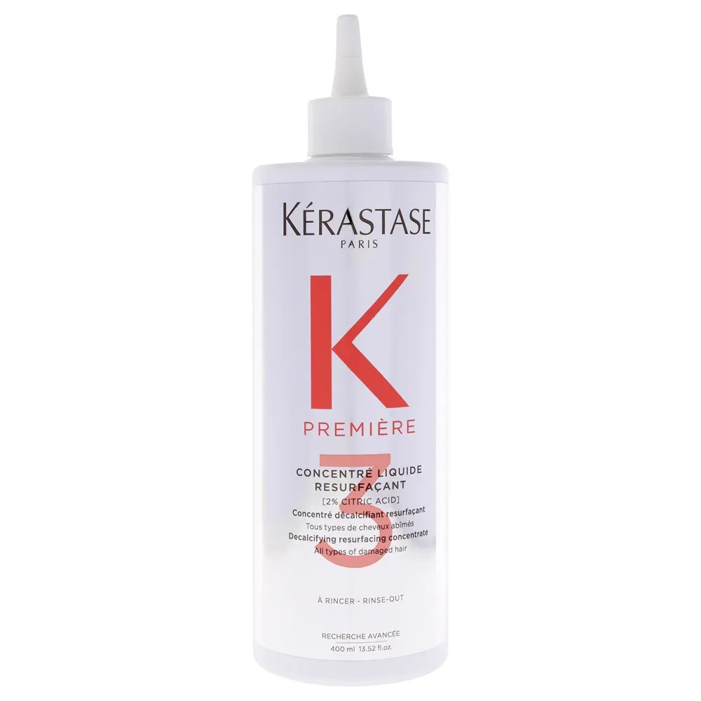 Premiere Decalcifying Resurfacing Concentrate Treatment is a pre-shampoo concentrate that helps remove hard-water calcium build-up, leaving hair feeling cleaner, softer, and more resilient. Powered by 2% citric acid and glycine within an 8% blend of pure acids, plus wisteria extract, it targets mineral deposits to support weakened fiber, improve strength, and restore a healthier-looking shine. As the formula works, hair looks smoother, feels easier to detangle, and styles with less effort, making it a practical reset for strands dulled or roughened by mineral overload. It suits all types of damaged hair affected by calcium overdose and leaves a bright, fresh scent of citrus, mandarin, orange blossom, and jasmine, while the cruelty-free formula is packaged in a bottle made from 95% recycled plastic.