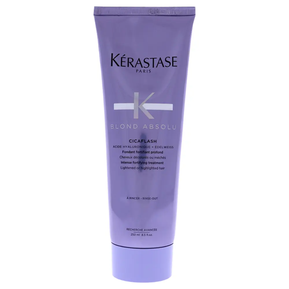 Blond Absolu Cicaflash Intense Fortifying restores and revitalizes weakened hair without weighing it down. Infused with purple pigments, it nourishes deeply, eliminating unwanted yellow and copper tones for a shinier finish. The opalescent formula, enriched with antioxidants and hyaluronic acid, provides intense hydration and helps prevent breakage. Perfect for all shades of blonde, this softens and calms sensitized hair fibers, ensuring a healthierlooking, lightweight feel.