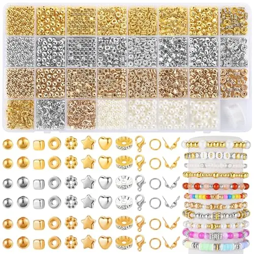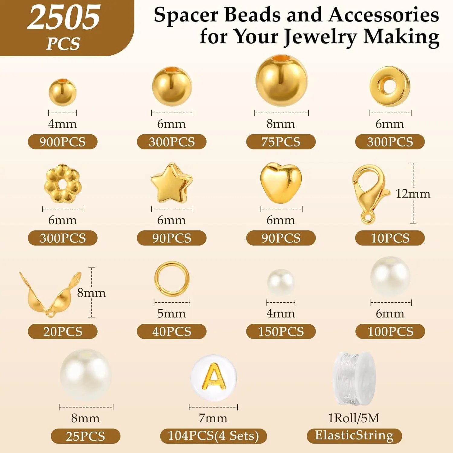 Funtopia Spacer Beads for Jewelry Making, 2500Pcs Gold Round Beads for Bracelets, 4mm 6mm 8mm Spacer Loose Ball Bead Star Pearls Letter Bead for DIY Bracelet Jewelry Making Craft