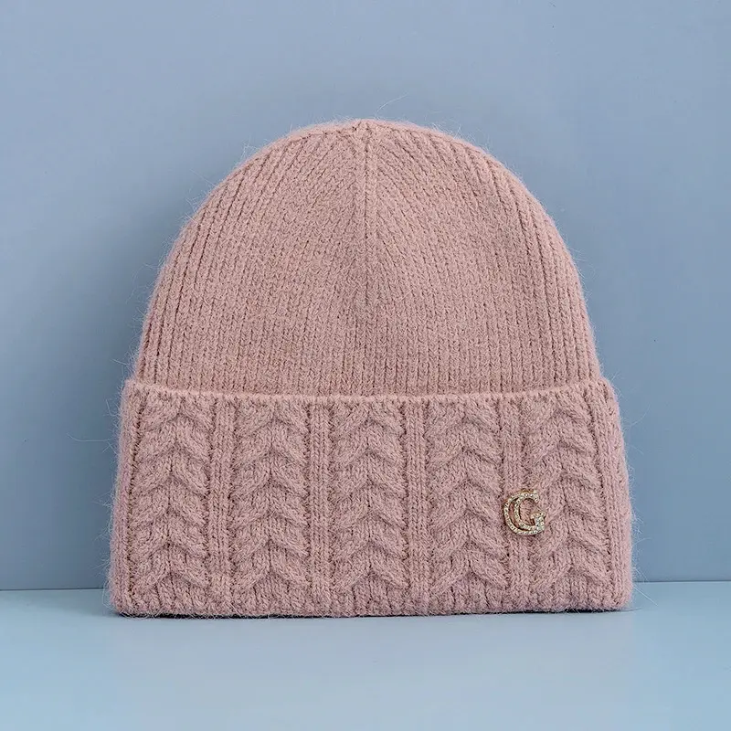 New Style Simple Chic Winter Hat G Letter Decor Rabbit Fur Beanie Elegant Winter Hats For Women Candy Colors Warm Knit Hats
