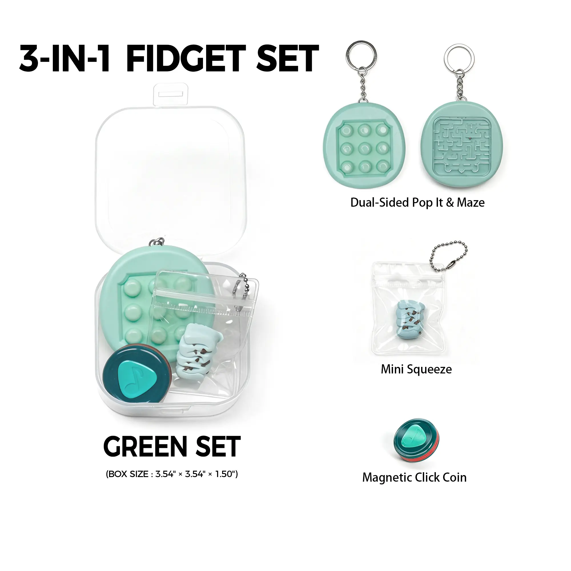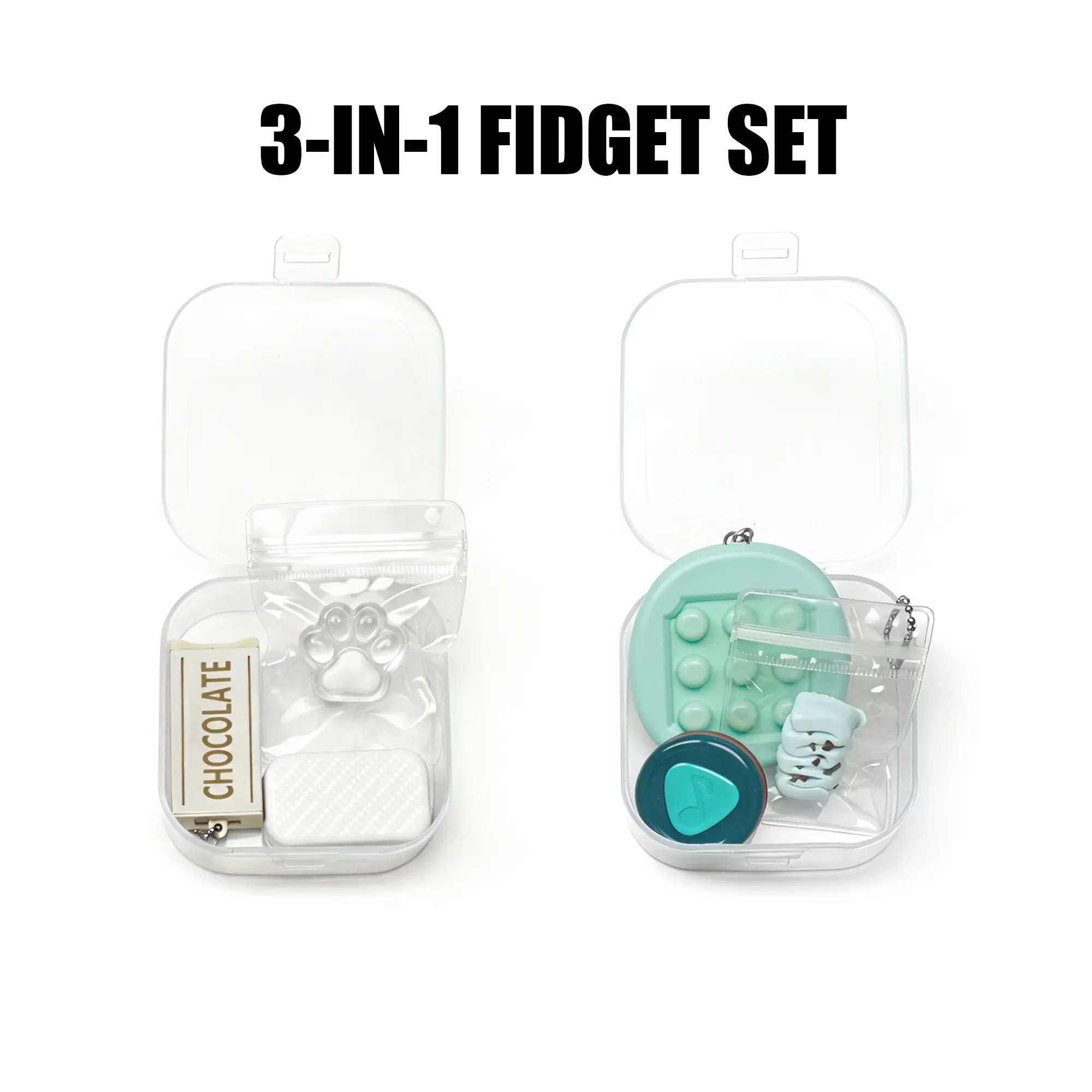 Each set comes with a durable transparent storage case (3.54" x 3.54" x 1.50") to keep your fidget toys organized. Choose between two color options, each with high-quality fidget tools to meet your stress relief needs: