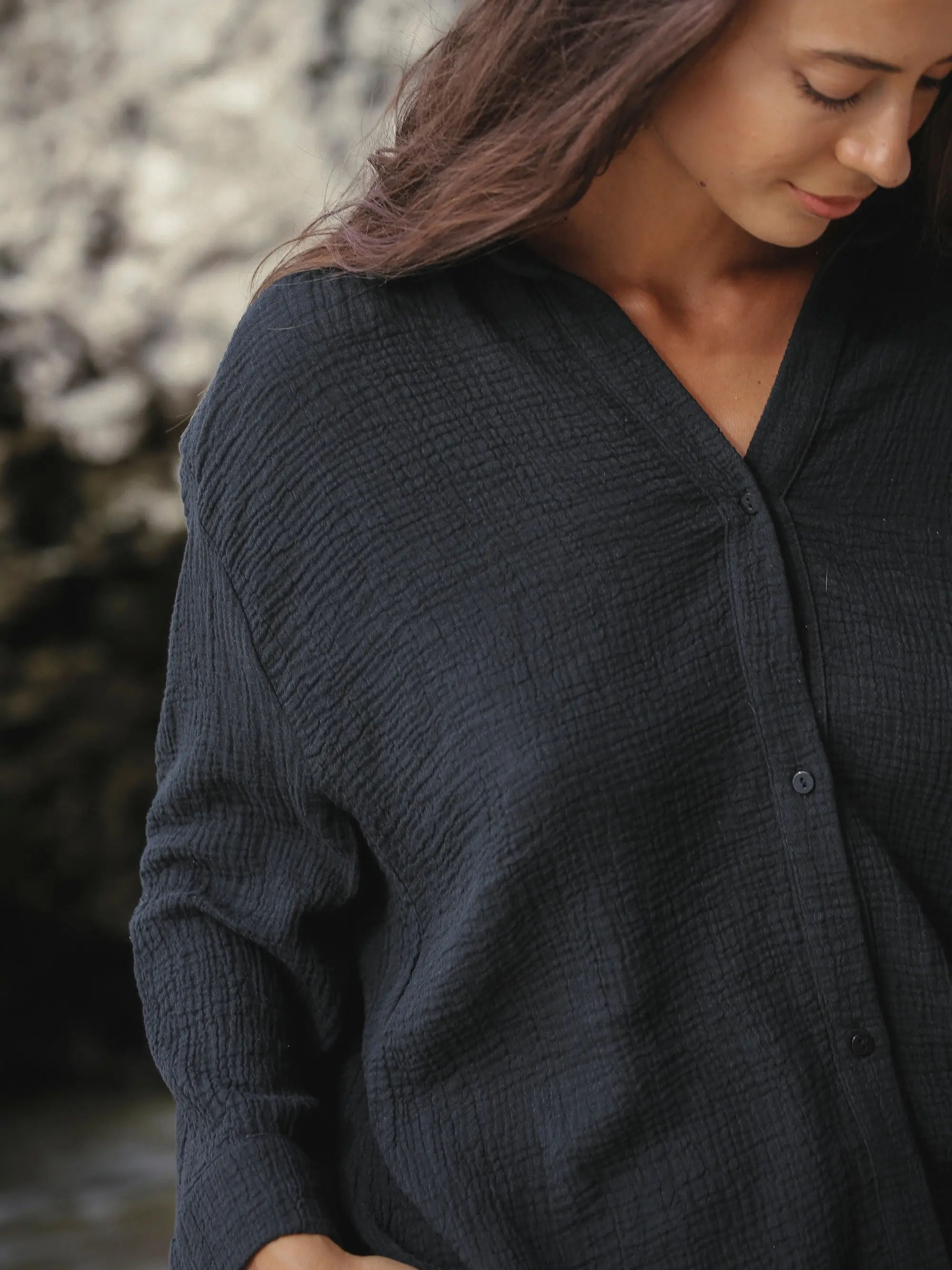Echo Maxi Shirt Black airy trans-seasonal dress designed for relaxed fit and can be worn in many ways to count; at home as loungewear, at work or during travels. Eco friendly design featured in a light-weighted 100% Turkish cotton is detailed button-down with a collar, sits loosely off the body and falls under the hip. Looks perfect paired with our Echo Boy short.