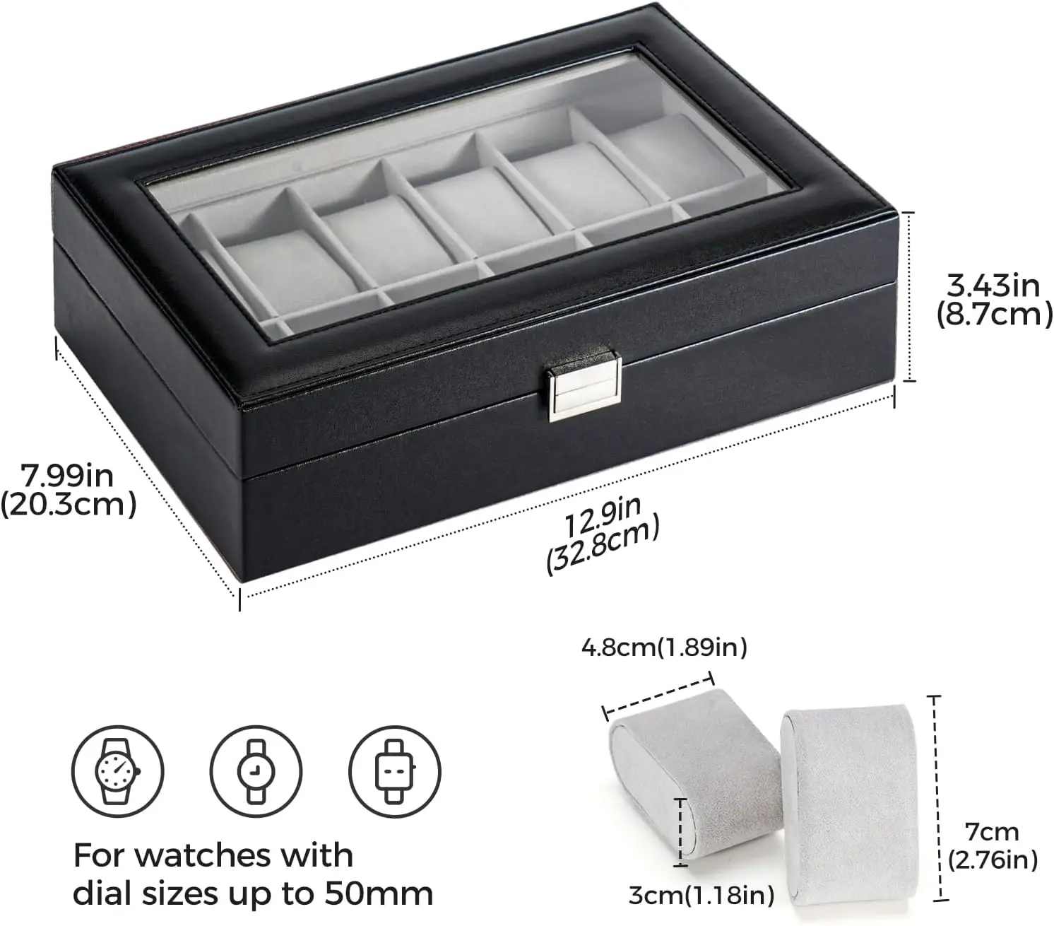 Watch Organizer can store 12 watches and fit different types of watches with a dial size up to 48 mm; Dimension: 12.9"W x 7.99"D x 3.43"H (32.8*20.3*8.7cm).