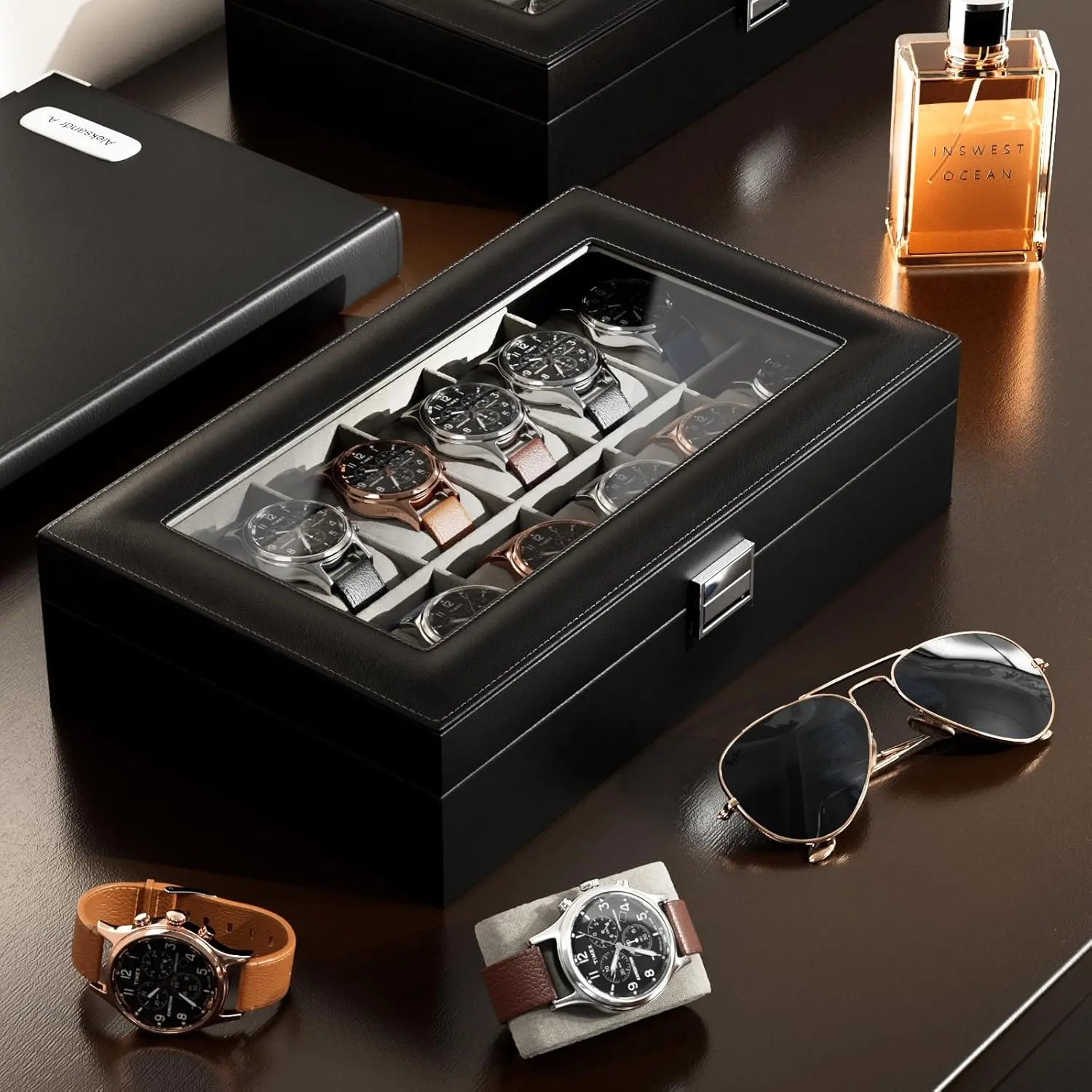 Watch Box Organizer, 12 Slot Watch Display Case With Glass Lid, Watch Storage Holder Mens Watch Case, Anniversary Birthday Valentine Gifts for Men Women -12 Slot, Black