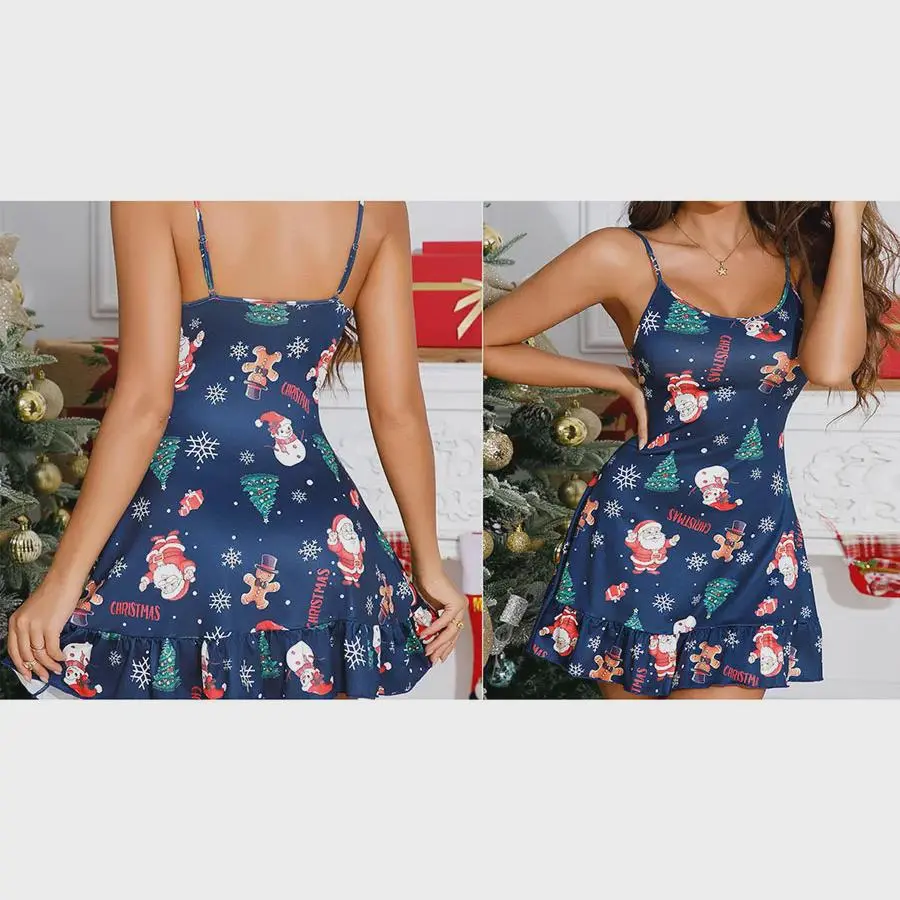 Womens Slip Sleep Dress Christmas Elements Print Adjustable Thin Spaghetti Straps O-Neck Ruffled Hem A-line Nightgowns
