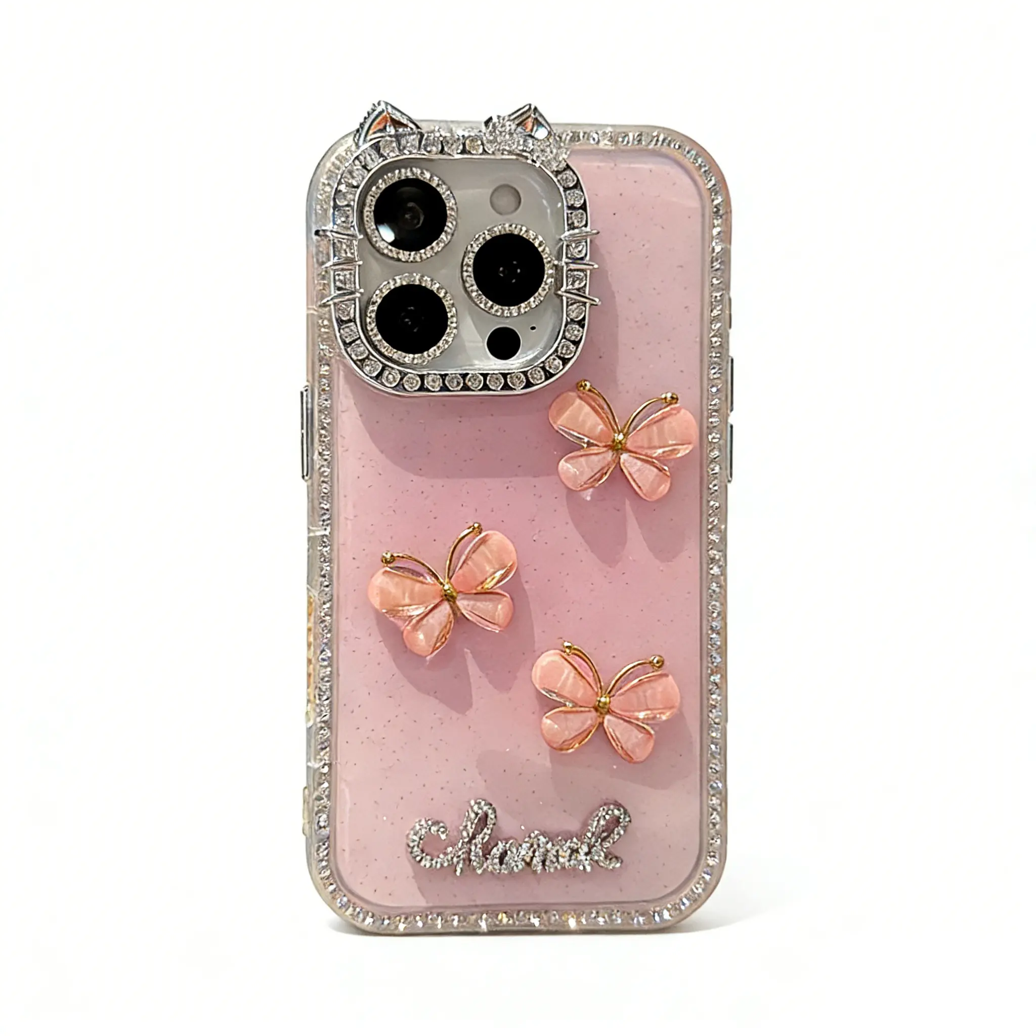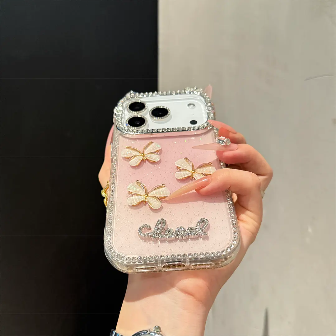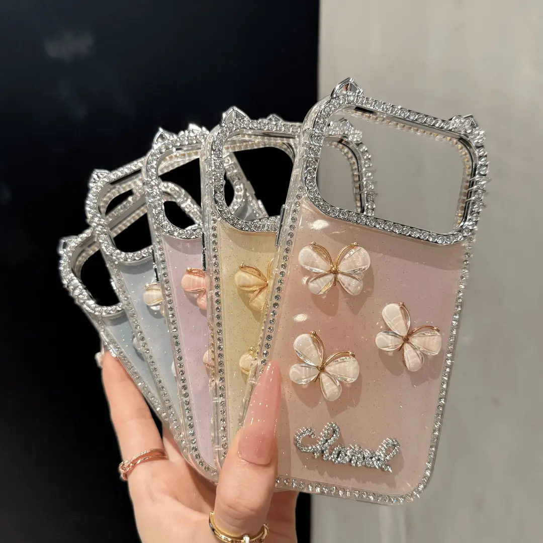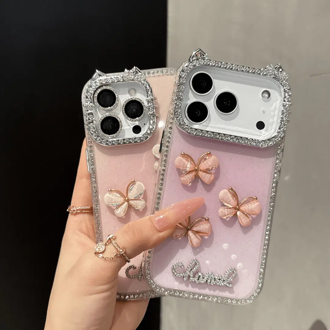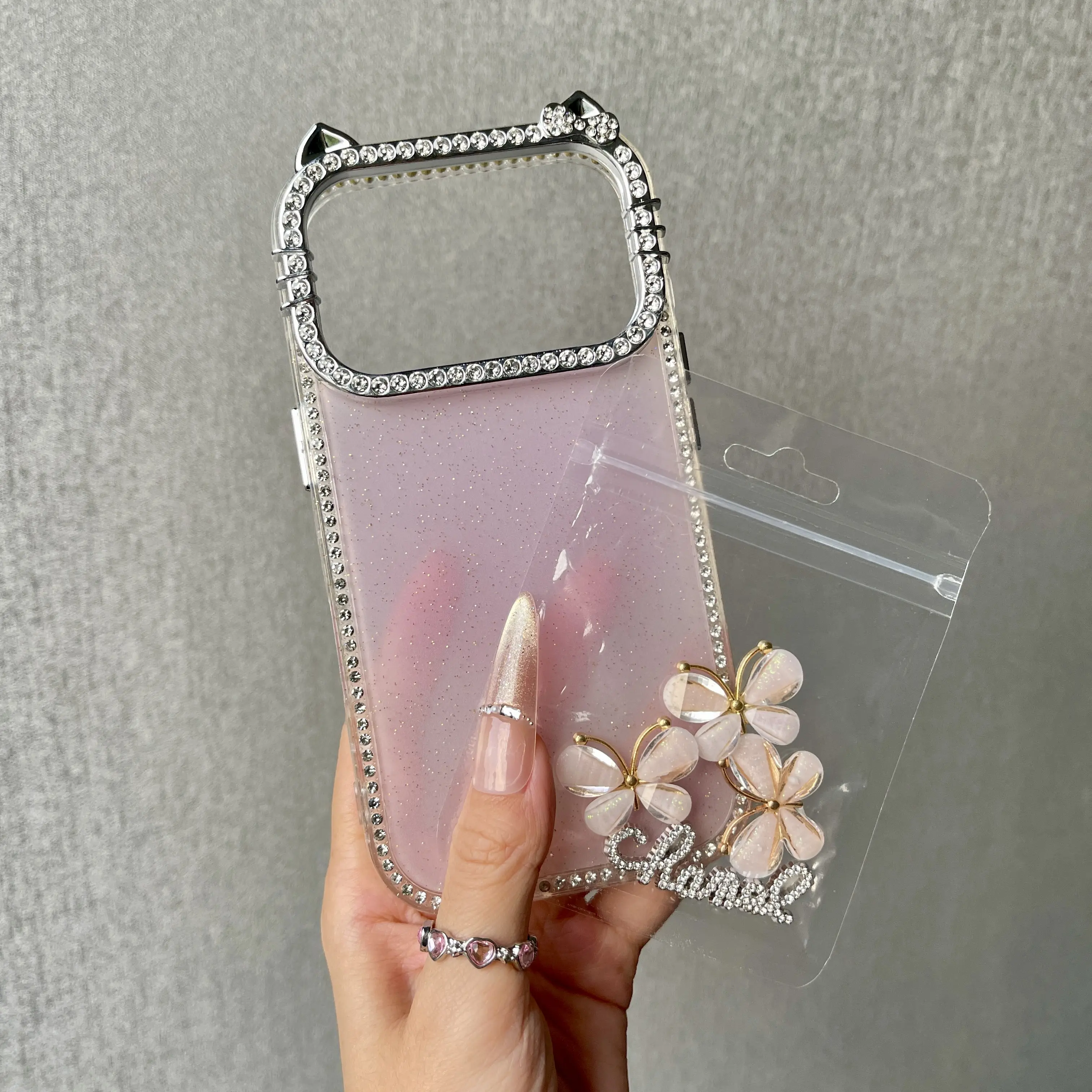 DIY Glitter Clear Phone Case with 3D Butterfly & Rhinestone Charms, Bling Cat Ear Diamond Frame Customizable Protective Cover for IP 17 PROMAX junk