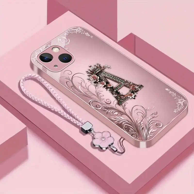Crown Floral Art 26 letter Phone Case, Suitable for [iPhone 15 Plus] high-end women's, Lanyard a beautiful four-leaf clover lanyard is included 952