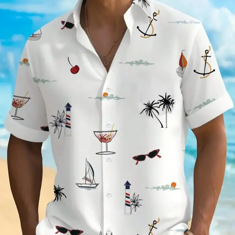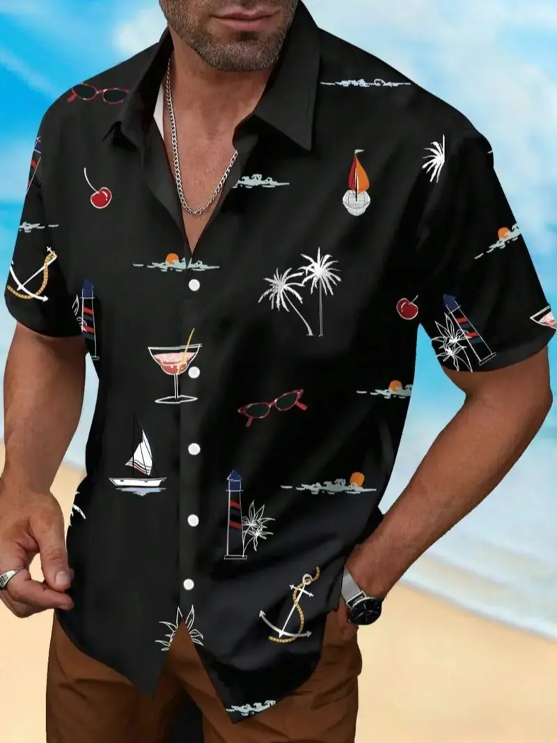 Men's Fashion Casual Short Sleeve Hawaiian Shirt, Menswear, Fitted Tropical Palm Tree and Geometric Print, Perfect for Beach and Summer Holidays,Limited-time offer, fast shipping