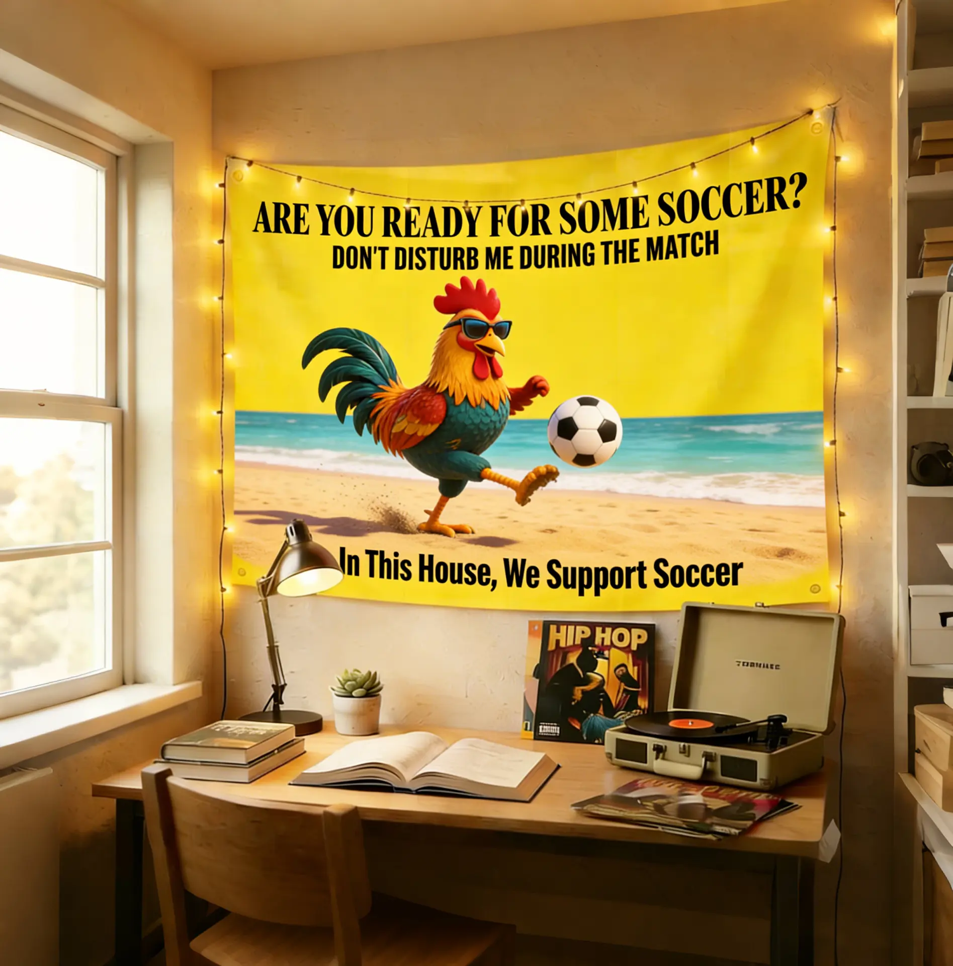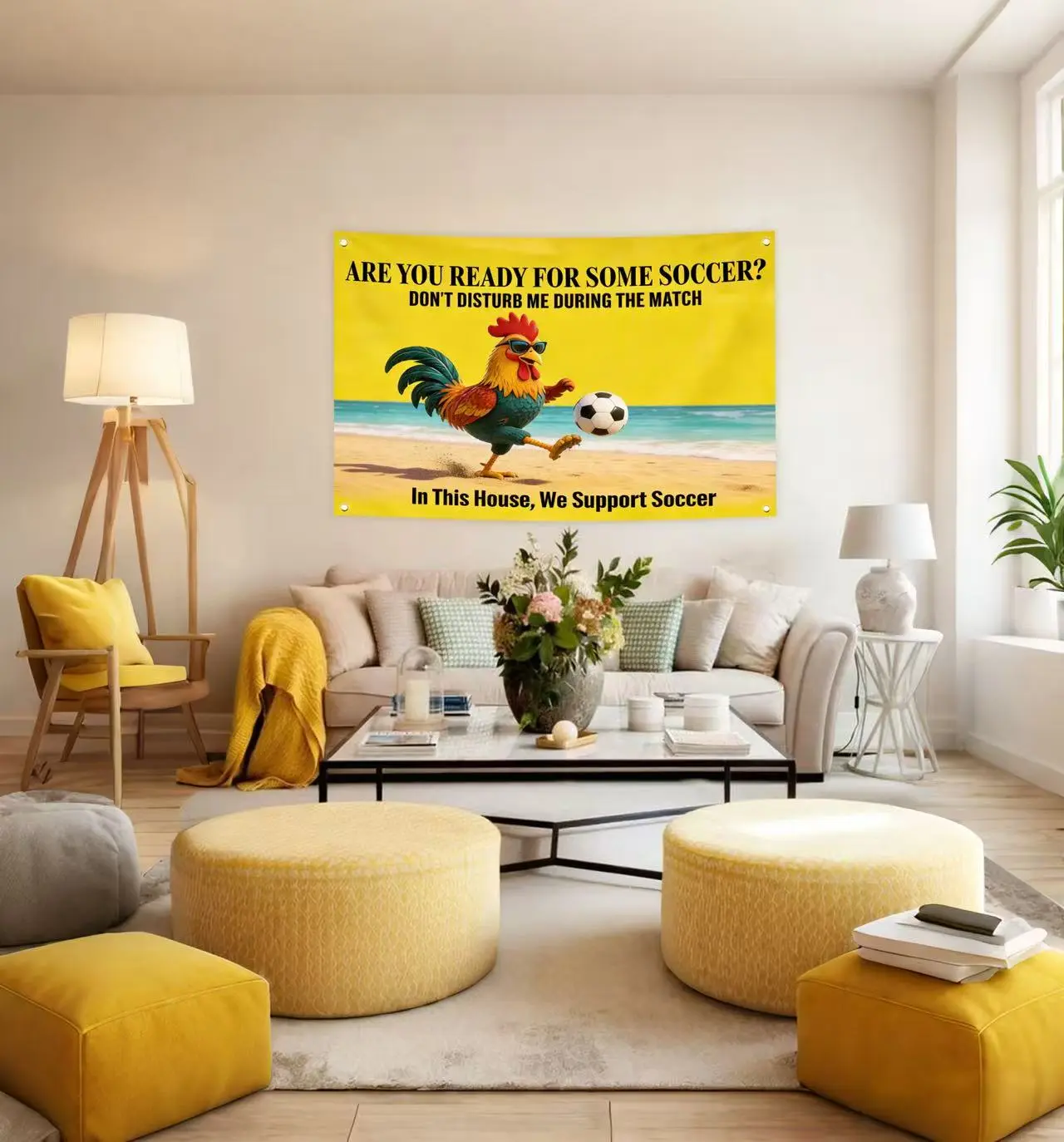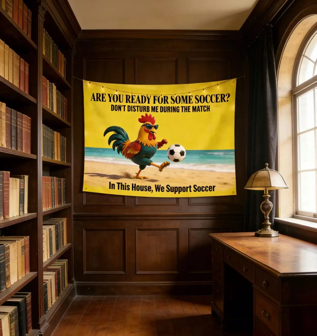 Featuring a cool, sun-glassed rooster ready to kick off, this flag tells everyone: 'I’m busy watching the match!' Durable enough for outdoor tailgates and stylish enough for indoor decor. Grab yours and let the games begin!"Vivid Colors, All-Weather Ready: High-definition printing ensures sharp details and UV-resistant colors that stay vibrant even in sunlight, rain, or wind