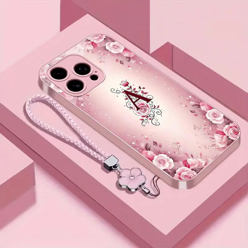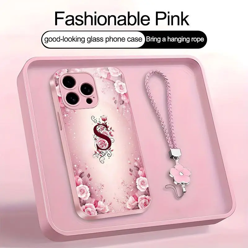 Luxury Rose Floral Monogram Initial Letter Metallic Paint Glass Case for iPhone Elegant Glossy Protective Cover 952