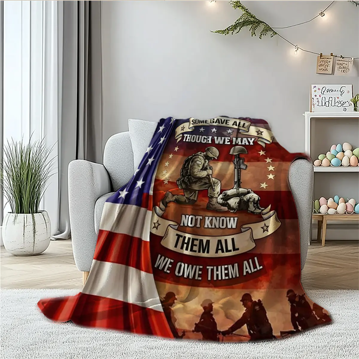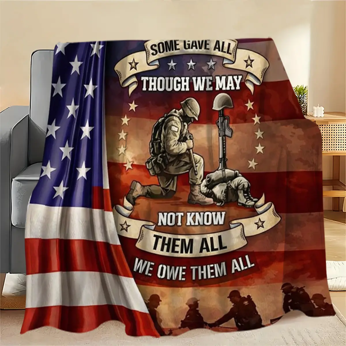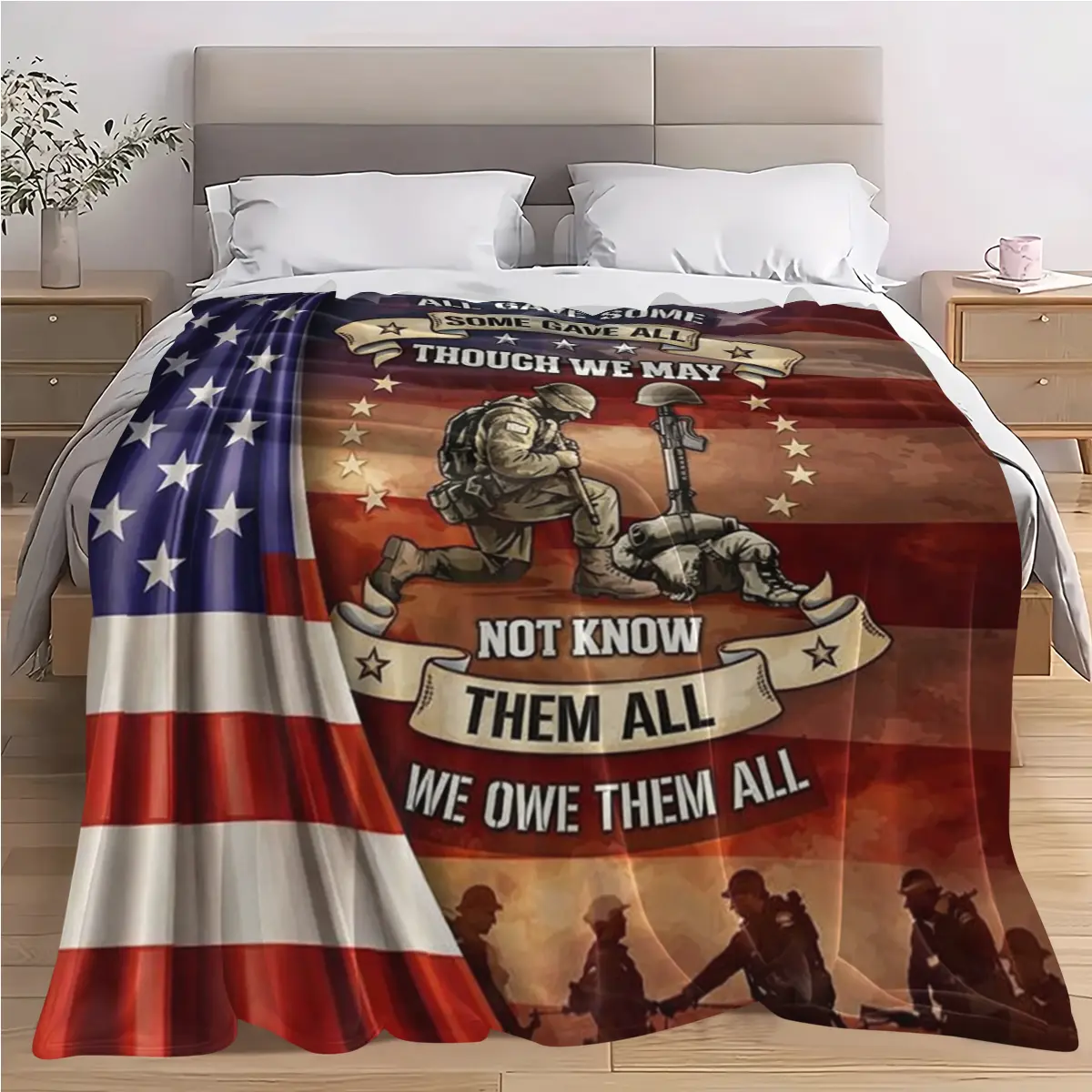 This premium military memorial blanket is a heartfelt tribute to the brave men and women who sacrificed everything for our freedom. Featuring the iconic slogan “All Gave Some, Some Gave All” and the classic Battlefield Cross symbol, it’s more than just a blanket—it’s a lasting reminder of the courage, sacrifice, and brotherhood of our U.S. service members.