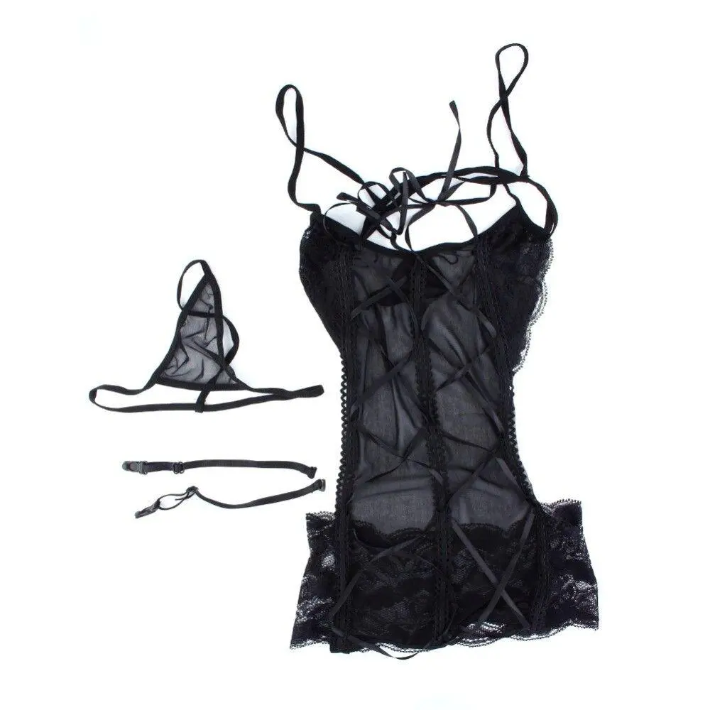 Women's Lingerie Sets Sexy Lace Bodysuit with Thigh Cuffs and Thong Underwear Teddy Babydolls Sleepwear Garter No Stockings