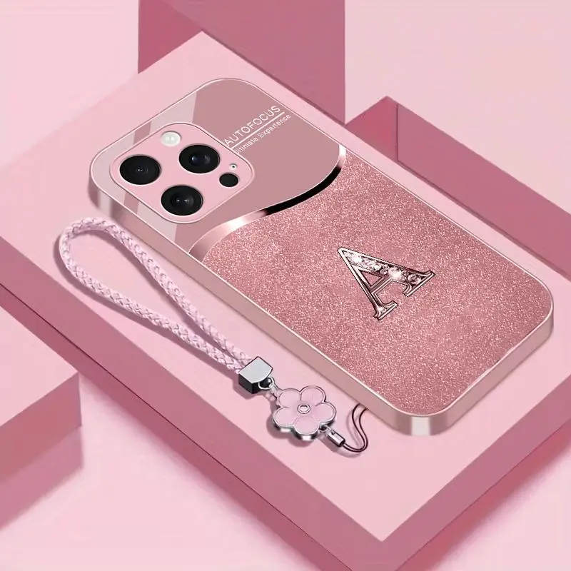 Luxury Pink Phone Case with Lanyard Initial Letter A-Z Cover for iPhone 16 Pro Max --975