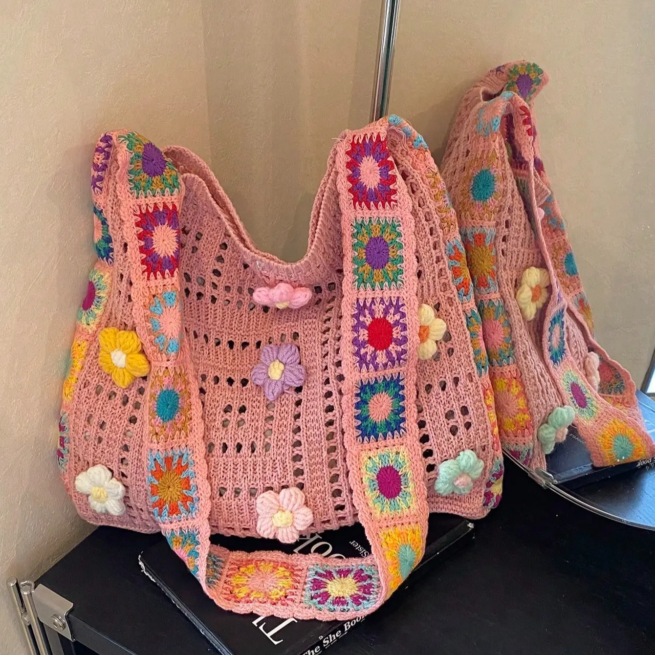 Retro Hollow-Out Floral Contrast Color Casual Crossbody Bag(The Color Position Of Flowers Is Random)
