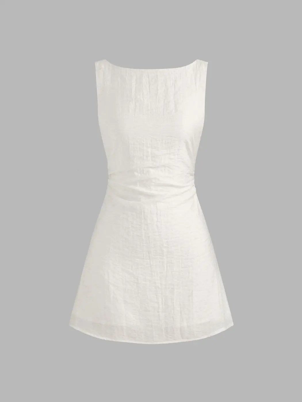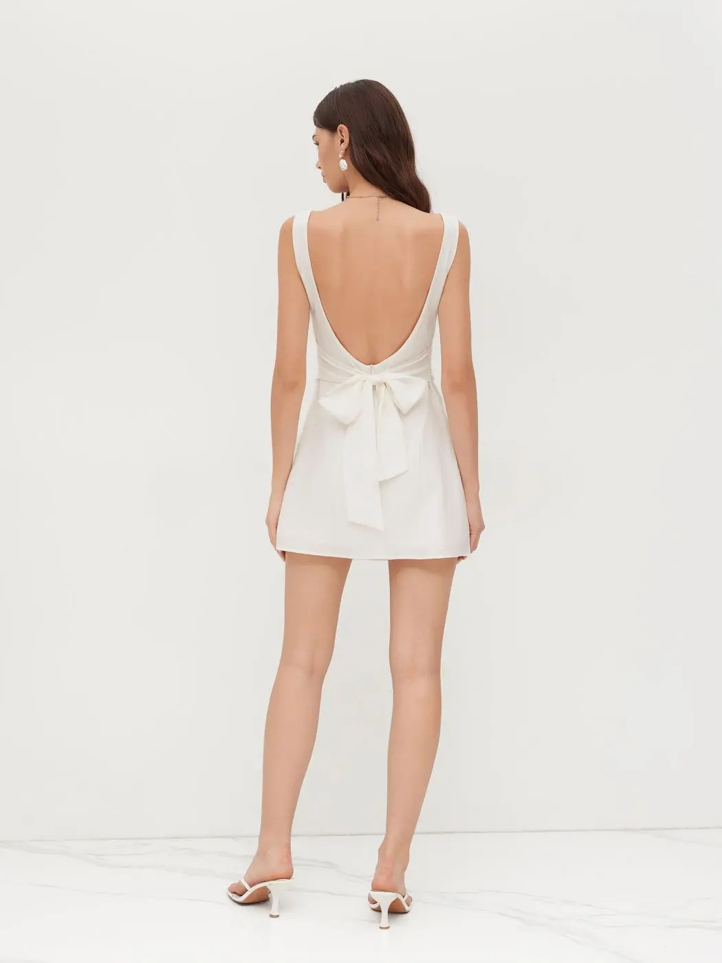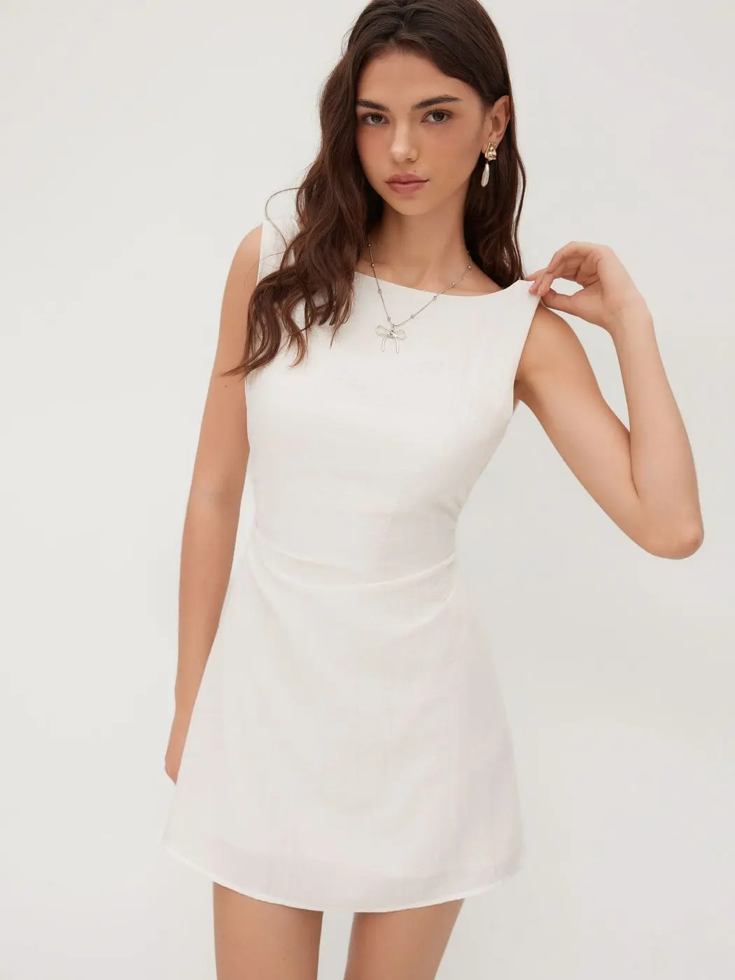 Women’s Linen Blend Backless Mini Dress – Boat Neck Tie Back Summer Beach Dress