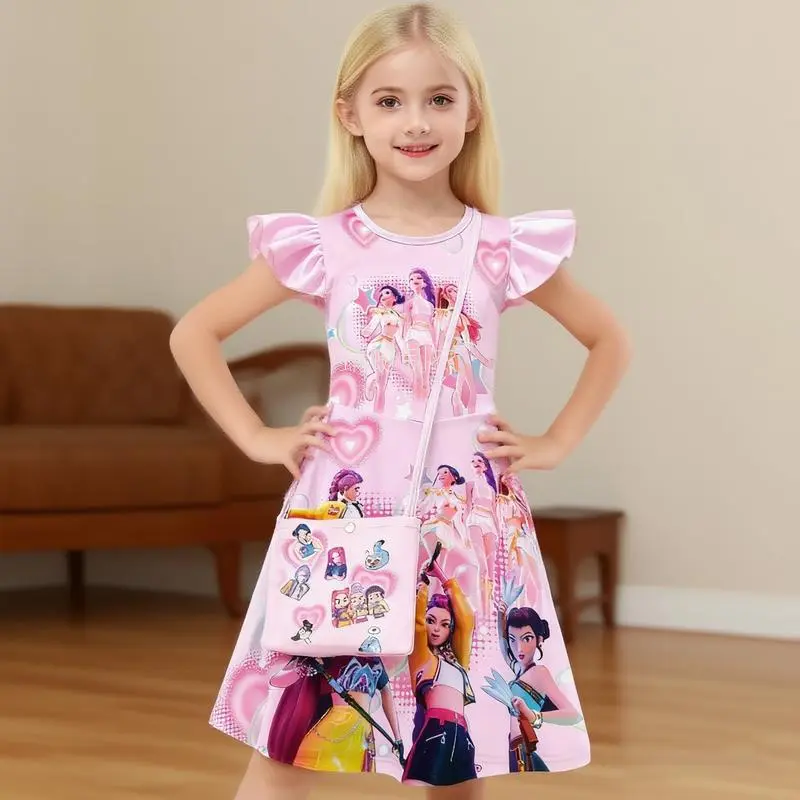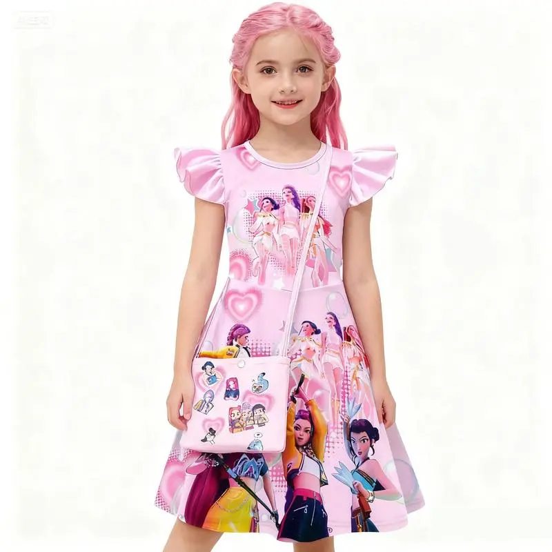 NewGirls KPOP Demon Hunter Huntrix Role Printed Sleeve Dress with Bag,Rumi Mira Zoey Character Design Outfits Casual Fit for Kids 3-14 Years